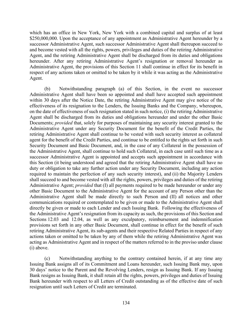 134 which has an office in New York, New York with a combined capital and surplus of at least $250,000,000. Upon the acceptance of any appointment as Administrative Agent hereunder by a successor Administrative Agent, such successor Administrative Agent shall thereupon succeed to and become vested with all the rights, powers, privileges and duties of the retiring Administrative Agent, and the retiring Administrative Agent shall be discharged from its duties and obligations hereunder. After any retiring Administrative Agent’s resignation or removal hereunder as Administrative Agent, the provisions of this Section 11 shall continue in effect for its benefit in respect of any actions taken or omitted to be taken by it while it was acting as the Administrative Agent. (b) Notwithstanding paragraph (a) of this Section, in the event no successor Administrative Agent shall have been so appointed and shall have accepted such appointment within 30 days after the Notice Date, the retiring Administrative Agent may give notice of the effectiveness of its resignation to the Lenders, the Issuing Banks and the Company, whereupon, on the date of effectiveness of such resignation stated in such notice, (i) the retiring Administrative Agent shall be discharged from its duties and obligations hereunder and under the other Basic Documents; provided that, solely for purposes of maintaining any security interest granted to the Administrative Agent under any Security Document for the benefit of the Credit Parties, the retiring Administrative Agent shall continue to be vested with such security interest as collateral agent for the benefit of the Credit Parties, and continue to be entitled to the rights set forth in such Security Document and Basic Document, and, in the case of any Collateral in the possession of the Administrative Agent, shall continue to hold such Collateral, in each case until such time as a successor Administrative Agent is appointed and accepts such appointment in accordance with this Section (it being understood and agreed that the retiring Administrative Agent shall have no duty or obligation to take any further action under any Security Document, including any action required to maintain the perfection of any such security interest), and (ii) the Majority Lenders shall succeed to and become vested with all the rights, powers, privileges and duties of the retiring Administrative Agent; provided that (I) all payments required to be made hereunder or under any other Basic Document to the Administrative Agent for the account of any Person other than the Administrative Agent shall be made directly to such Person and (II) all notices and other communications required or contemplated to be given or made to the Administrative Agent shall directly be given or made to each Lender and each Issuing Bank. Following the effectiveness of the Administrative Agent’s resignation from its capacity as such, the provisions of this Section and Sections 12.03 and 12.04, as well as any exculpatory, reimbursement and indemnification provisions set forth in any other Basic Document, shall continue in effect for the benefit of such retiring Administrative Agent, its sub-agents and their respective Related Parties in respect of any actions taken or omitted to be taken by any of them while the retiring Administrative Agent was acting as Administrative Agent and in respect of the matters referred to in the proviso under clause (i) above. (c) Notwithstanding anything to the contrary contained herein, if at any time any Issuing Bank assigns all of its Commitment and Loans hereunder, such Issuing Bank may, upon 30 days’ notice to the Parent and the Revolving Lenders, resign as Issuing Bank. If any Issuing Bank resigns as Issuing Bank, it shall retain all the rights, powers, privileges and duties of Issuing Bank hereunder with respect to all Letters of Credit outstanding as of the effective date of such resignation until such Letters of Credit are terminated.