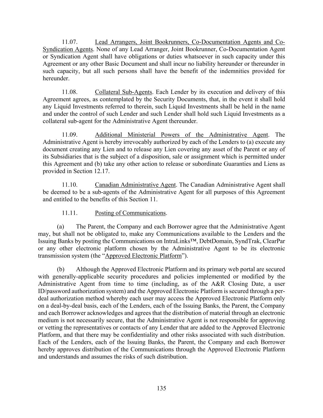 135 11.07. Lead Arrangers, Joint Bookrunners, Co-Documentation Agents and Co- Syndication Agents. None of any Lead Arranger, Joint Bookrunner, Co-Documentation Agent or Syndication Agent shall have obligations or duties whatsoever in such capacity under this Agreement or any other Basic Document and shall incur no liability hereunder or thereunder in such capacity, but all such persons shall have the benefit of the indemnities provided for hereunder. 11.08. Collateral Sub-Agents. Each Lender by its execution and delivery of this Agreement agrees, as contemplated by the Security Documents, that, in the event it shall hold any Liquid Investments referred to therein, such Liquid Investments shall be held in the name and under the control of such Lender and such Lender shall hold such Liquid Investments as a collateral sub-agent for the Administrative Agent thereunder. 11.09. Additional Ministerial Powers of the Administrative Agent. The Administrative Agent is hereby irrevocably authorized by each of the Lenders to (a) execute any document creating any Lien and to release any Lien covering any asset of the Parent or any of its Subsidiaries that is the subject of a disposition, sale or assignment which is permitted under this Agreement and (b) take any other action to release or subordinate Guaranties and Liens as provided in Section 12.17. 11.10. Canadian Administrative Agent. The Canadian Administrative Agent shall be deemed to be a sub-agents of the Administrative Agent for all purposes of this Agreement and entitled to the benefits of this Section 11. 11.11. Posting of Communications. (a) The Parent, the Company and each Borrower agree that the Administrative Agent may, but shall not be obligated to, make any Communications available to the Lenders and the Issuing Banks by posting the Communications on IntraLinks™, DebtDomain, SyndTrak, ClearPar or any other electronic platform chosen by the Administrative Agent to be its electronic transmission system (the “Approved Electronic Platform”). (b) Although the Approved Electronic Platform and its primary web portal are secured with generally-applicable security procedures and policies implemented or modified by the Administrative Agent from time to time (including, as of the A&R Closing Date, a user ID/password authorization system) and the Approved Electronic Platform is secured through a per- deal authorization method whereby each user may access the Approved Electronic Platform only on a deal-by-deal basis, each of the Lenders, each of the Issuing Banks, the Parent, the Company and each Borrower acknowledges and agrees that the distribution of material through an electronic medium is not necessarily secure, that the Administrative Agent is not responsible for approving or vetting the representatives or contacts of any Lender that are added to the Approved Electronic Platform, and that there may be confidentiality and other risks associated with such distribution. Each of the Lenders, each of the Issuing Banks, the Parent, the Company and each Borrower hereby approves distribution of the Communications through the Approved Electronic Platform and understands and assumes the risks of such distribution.