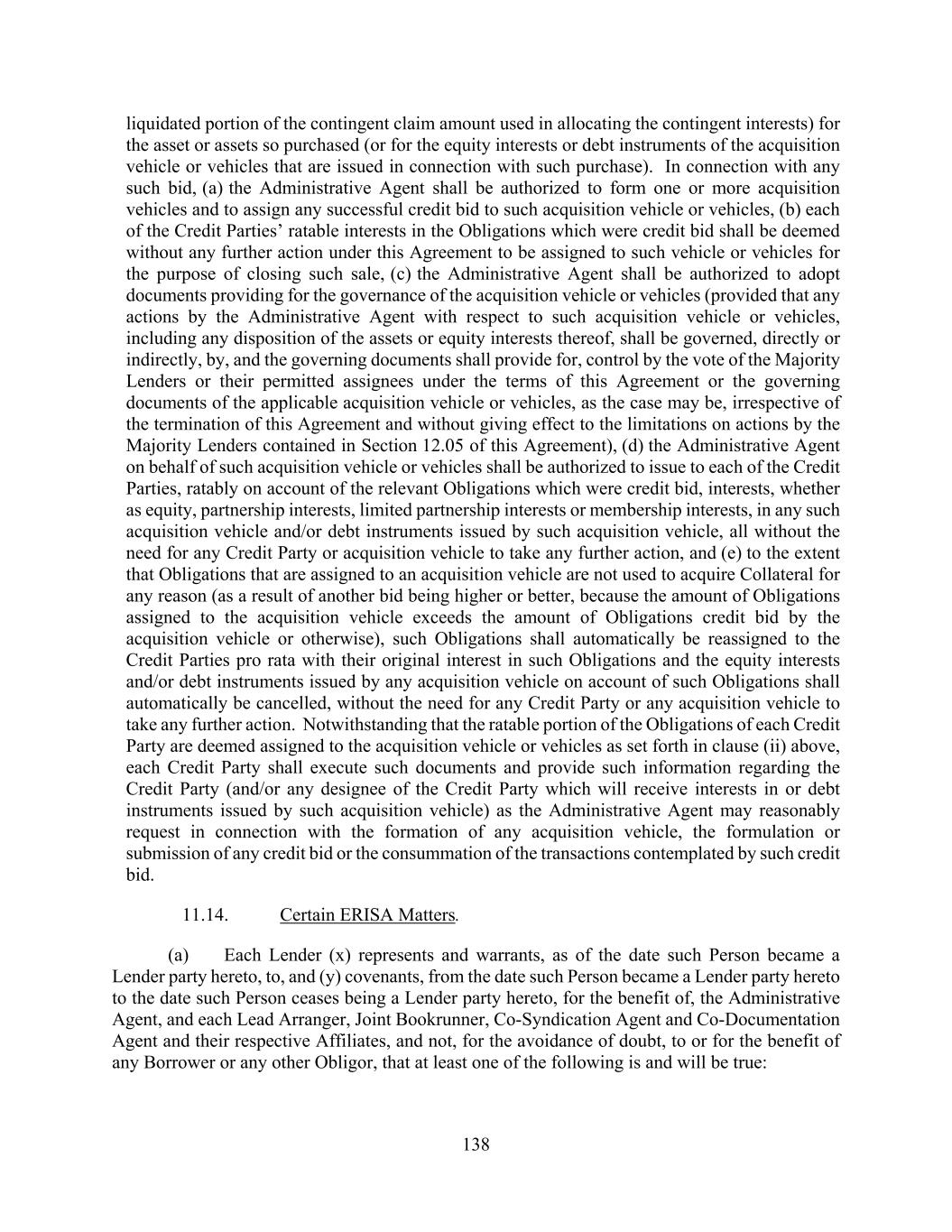 138 liquidated portion of the contingent claim amount used in allocating the contingent interests) for the asset or assets so purchased (or for the equity interests or debt instruments of the acquisition vehicle or vehicles that are issued in connection with such purchase). In connection with any such bid, (a) the Administrative Agent shall be authorized to form one or more acquisition vehicles and to assign any successful credit bid to such acquisition vehicle or vehicles, (b) each of the Credit Parties’ ratable interests in the Obligations which were credit bid shall be deemed without any further action under this Agreement to be assigned to such vehicle or vehicles for the purpose of closing such sale, (c) the Administrative Agent shall be authorized to adopt documents providing for the governance of the acquisition vehicle or vehicles (provided that any actions by the Administrative Agent with respect to such acquisition vehicle or vehicles, including any disposition of the assets or equity interests thereof, shall be governed, directly or indirectly, by, and the governing documents shall provide for, control by the vote of the Majority Lenders or their permitted assignees under the terms of this Agreement or the governing documents of the applicable acquisition vehicle or vehicles, as the case may be, irrespective of the termination of this Agreement and without giving effect to the limitations on actions by the Majority Lenders contained in Section 12.05 of this Agreement), (d) the Administrative Agent on behalf of such acquisition vehicle or vehicles shall be authorized to issue to each of the Credit Parties, ratably on account of the relevant Obligations which were credit bid, interests, whether as equity, partnership interests, limited partnership interests or membership interests, in any such acquisition vehicle and/or debt instruments issued by such acquisition vehicle, all without the need for any Credit Party or acquisition vehicle to take any further action, and (e) to the extent that Obligations that are assigned to an acquisition vehicle are not used to acquire Collateral for any reason (as a result of another bid being higher or better, because the amount of Obligations assigned to the acquisition vehicle exceeds the amount of Obligations credit bid by the acquisition vehicle or otherwise), such Obligations shall automatically be reassigned to the Credit Parties pro rata with their original interest in such Obligations and the equity interests and/or debt instruments issued by any acquisition vehicle on account of such Obligations shall automatically be cancelled, without the need for any Credit Party or any acquisition vehicle to take any further action. Notwithstanding that the ratable portion of the Obligations of each Credit Party are deemed assigned to the acquisition vehicle or vehicles as set forth in clause (ii) above, each Credit Party shall execute such documents and provide such information regarding the Credit Party (and/or any designee of the Credit Party which will receive interests in or debt instruments issued by such acquisition vehicle) as the Administrative Agent may reasonably request in connection with the formation of any acquisition vehicle, the formulation or submission of any credit bid or the consummation of the transactions contemplated by such credit bid. 11.14. Certain ERISA Matters. (a) Each Lender (x) represents and warrants, as of the date such Person became a Lender party hereto, to, and (y) covenants, from the date such Person became a Lender party hereto to the date such Person ceases being a Lender party hereto, for the benefit of, the Administrative Agent, and each Lead Arranger, Joint Bookrunner, Co-Syndication Agent and Co-Documentation Agent and their respective Affiliates, and not, for the avoidance of doubt, to or for the benefit of any Borrower or any other Obligor, that at least one of the following is and will be true: