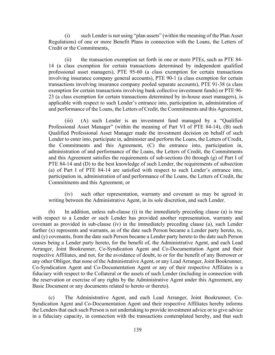 139 (i) such Lender is not using “plan assets” (within the meaning of the Plan Asset Regulations) of one or more Benefit Plans in connection with the Loans, the Letters of Credit or the Commitments, (ii) the transaction exemption set forth in one or more PTEs, such as PTE 84- 14 (a class exemption for certain transactions determined by independent qualified professional asset managers), PTE 95-60 (a class exemption for certain transactions involving insurance company general accounts), PTE 90-1 (a class exemption for certain transactions involving insurance company pooled separate accounts), PTE 91-38 (a class exemption for certain transactions involving bank collective investment funds) or PTE 96- 23 (a class exemption for certain transactions determined by in-house asset managers), is applicable with respect to such Lender’s entrance into, participation in, administration of and performance of the Loans, the Letters of Credit, the Commitments and this Agreement, (iii) (A) such Lender is an investment fund managed by a “Qualified Professional Asset Manager” (within the meaning of Part VI of PTE 84-14), (B) such Qualified Professional Asset Manager made the investment decision on behalf of such Lender to enter into, participate in, administer and perform the Loans, the Letters of Credit, the Commitments and this Agreement, (C) the entrance into, participation in, administration of and performance of the Loans, the Letters of Credit, the Commitments and this Agreement satisfies the requirements of sub-sections (b) through (g) of Part I of PTE 84-14 and (D) to the best knowledge of such Lender, the requirements of subsection (a) of Part I of PTE 84-14 are satisfied with respect to such Lender’s entrance into, participation in, administration of and performance of the Loans, the Letters of Credit, the Commitments and this Agreement, or (iv) such other representation, warranty and covenant as may be agreed in writing between the Administrative Agent, in its sole discretion, and such Lender. (b) In addition, unless sub-clause (i) in the immediately preceding clause (a) is true with respect to a Lender or such Lender has provided another representation, warranty and covenant as provided in sub-clause (iv) in the immediately preceding clause (a), such Lender further (x) represents and warrants, as of the date such Person became a Lender party hereto, to, and (y) covenants, from the date such Person became a Lender party hereto to the date such Person ceases being a Lender party hereto, for the benefit of, the Administrative Agent, and each Lead Arranger, Joint Bookrunner, Co-Syndication Agent and Co-Documentation Agent and their respective Affiliates, and not, for the avoidance of doubt, to or for the benefit of any Borrower or any other Obligor, that none of the Administrative Agent, or any Lead Arranger, Joint Bookrunner, Co-Syndication Agent and Co-Documentation Agent or any of their respective Affiliates is a fiduciary with respect to the Collateral or the assets of such Lender (including in connection with the reservation or exercise of any rights by the Administrative Agent under this Agreement, any Basic Document or any documents related to hereto or thereto). (c) The Administrative Agent, and each Lead Arranger, Joint Bookrunner, Co- Syndication Agent and Co-Documentation Agent and their respective Affiliates hereby informs the Lenders that each such Person is not undertaking to provide investment advice or to give advice in a fiduciary capacity, in connection with the transactions contemplated hereby, and that such