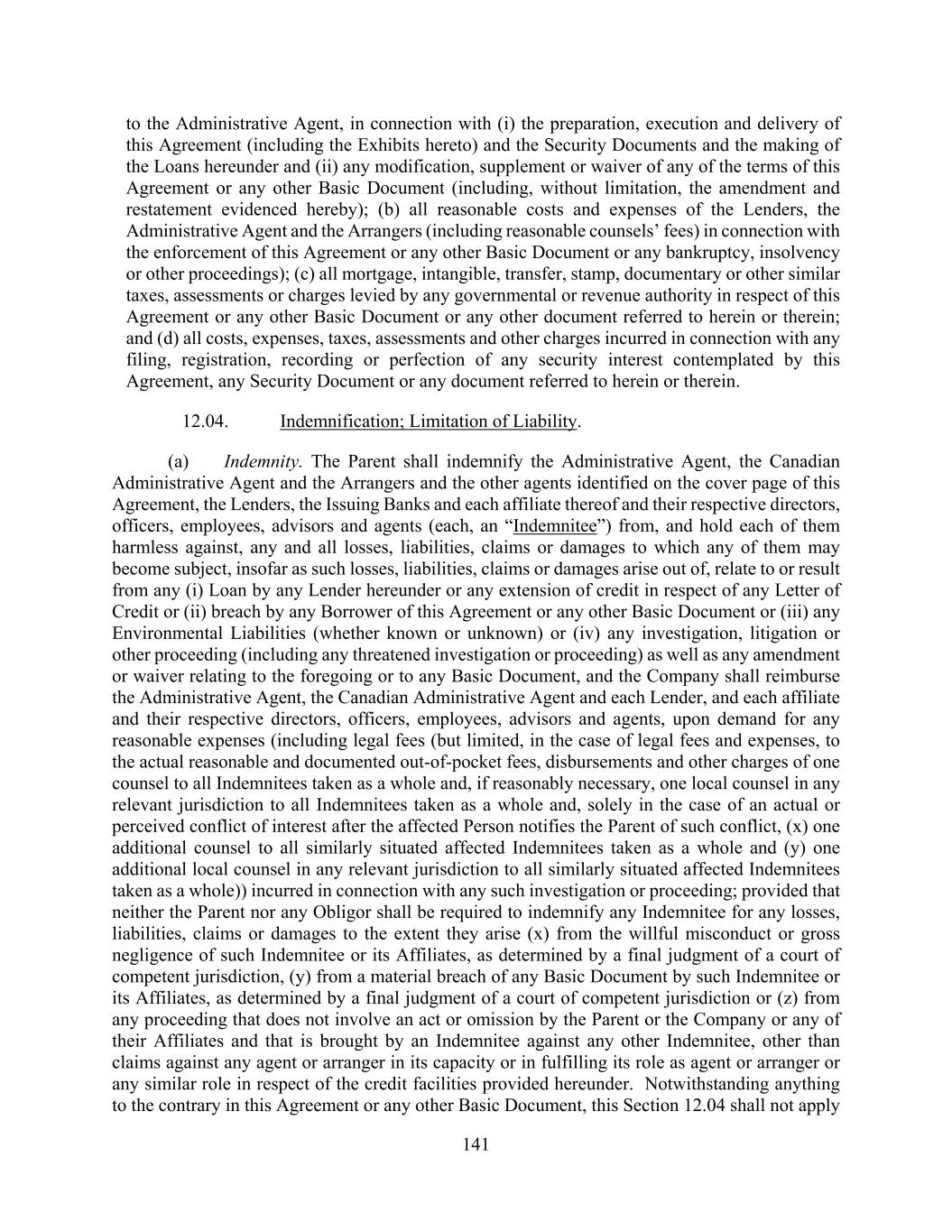 141 to the Administrative Agent, in connection with (i) the preparation, execution and delivery of this Agreement (including the Exhibits hereto) and the Security Documents and the making of the Loans hereunder and (ii) any modification, supplement or waiver of any of the terms of this Agreement or any other Basic Document (including, without limitation, the amendment and restatement evidenced hereby); (b) all reasonable costs and expenses of the Lenders, the Administrative Agent and the Arrangers (including reasonable counsels’ fees) in connection with the enforcement of this Agreement or any other Basic Document or any bankruptcy, insolvency or other proceedings); (c) all mortgage, intangible, transfer, stamp, documentary or other similar taxes, assessments or charges levied by any governmental or revenue authority in respect of this Agreement or any other Basic Document or any other document referred to herein or therein; and (d) all costs, expenses, taxes, assessments and other charges incurred in connection with any filing, registration, recording or perfection of any security interest contemplated by this Agreement, any Security Document or any document referred to herein or therein. 12.04. Indemnification; Limitation of Liability. (a) Indemnity. The Parent shall indemnify the Administrative Agent, the Canadian Administrative Agent and the Arrangers and the other agents identified on the cover page of this Agreement, the Lenders, the Issuing Banks and each affiliate thereof and their respective directors, officers, employees, advisors and agents (each, an “Indemnitee”) from, and hold each of them harmless against, any and all losses, liabilities, claims or damages to which any of them may become subject, insofar as such losses, liabilities, claims or damages arise out of, relate to or result from any (i) Loan by any Lender hereunder or any extension of credit in respect of any Letter of Credit or (ii) breach by any Borrower of this Agreement or any other Basic Document or (iii) any Environmental Liabilities (whether known or unknown) or (iv) any investigation, litigation or other proceeding (including any threatened investigation or proceeding) as well as any amendment or waiver relating to the foregoing or to any Basic Document, and the Company shall reimburse the Administrative Agent, the Canadian Administrative Agent and each Lender, and each affiliate and their respective directors, officers, employees, advisors and agents, upon demand for any reasonable expenses (including legal fees (but limited, in the case of legal fees and expenses, to the actual reasonable and documented out-of-pocket fees, disbursements and other charges of one counsel to all Indemnitees taken as a whole and, if reasonably necessary, one local counsel in any relevant jurisdiction to all Indemnitees taken as a whole and, solely in the case of an actual or perceived conflict of interest after the affected Person notifies the Parent of such conflict, (x) one additional counsel to all similarly situated affected Indemnitees taken as a whole and (y) one additional local counsel in any relevant jurisdiction to all similarly situated affected Indemnitees taken as a whole)) incurred in connection with any such investigation or proceeding; provided that neither the Parent nor any Obligor shall be required to indemnify any Indemnitee for any losses, liabilities, claims or damages to the extent they arise (x) from the willful misconduct or gross negligence of such Indemnitee or its Affiliates, as determined by a final judgment of a court of competent jurisdiction, (y) from a material breach of any Basic Document by such Indemnitee or its Affiliates, as determined by a final judgment of a court of competent jurisdiction or (z) from any proceeding that does not involve an act or omission by the Parent or the Company or any of their Affiliates and that is brought by an Indemnitee against any other Indemnitee, other than claims against any agent or arranger in its capacity or in fulfilling its role as agent or arranger or any similar role in respect of the credit facilities provided hereunder. Notwithstanding anything to the contrary in this Agreement or any other Basic Document, this Section 12.04 shall not apply