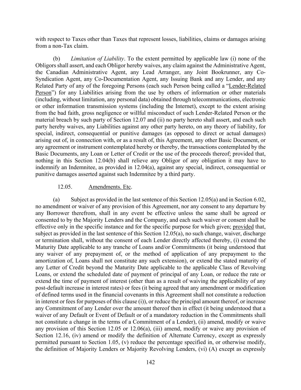 142 with respect to Taxes other than Taxes that represent losses, liabilities, claims or damages arising from a non-Tax claim. (b) Limitation of Liability. To the extent permitted by applicable law (i) none of the Obligors shall assert, and each Obligor hereby waives, any claim against the Administrative Agent, the Canadian Administrative Agent, any Lead Arranger, any Joint Bookrunner, any Co- Syndication Agent, any Co-Documentation Agent, any Issuing Bank and any Lender, and any Related Party of any of the foregoing Persons (each such Person being called a “Lender-Related Person”) for any Liabilities arising from the use by others of information or other materials (including, without limitation, any personal data) obtained through telecommunications, electronic or other information transmission systems (including the Internet), except to the extent arising from the bad faith, gross negligence or willful misconduct of such Lender-Related Person or the material breach by such party of Section 12.07 and (ii) no party hereto shall assert, and each such party hereby waives, any Liabilities against any other party hereto, on any theory of liability, for special, indirect, consequential or punitive damages (as opposed to direct or actual damages) arising out of, in connection with, or as a result of, this Agreement, any other Basic Document, or any agreement or instrument contemplated hereby or thereby, the transactions contemplated by the Basic Documents, any Loan or Letter of Credit or the use of the proceeds thereof; provided that, nothing in this Section 12.04(b) shall relieve any Obligor of any obligation it may have to indemnify an Indemnitee, as provided in 12.04(a), against any special, indirect, consequential or punitive damages asserted against such Indemnitee by a third party. 12.05. Amendments. Etc. (a) Subject as provided in the last sentence of this Section 12.05(a) and in Section 6.02, no amendment or waiver of any provision of this Agreement, nor any consent to any departure by any Borrower therefrom, shall in any event be effective unless the same shall be agreed or consented to by the Majority Lenders and the Company, and each such waiver or consent shall be effective only in the specific instance and for the specific purpose for which given; provided that, subject as provided in the last sentence of this Section 12.05(a), no such change, waiver, discharge or termination shall, without the consent of each Lender directly affected thereby, (i) extend the Maturity Date applicable to any tranche of Loans and/or Commitments (it being understood that any waiver of any prepayment of, or the method of application of any prepayment to the amortization of, Loans shall not constitute any such extension), or extend the stated maturity of any Letter of Credit beyond the Maturity Date applicable to the applicable Class of Revolving Loans, or extend the scheduled date of payment of principal of any Loan, or reduce the rate or extend the time of payment of interest (other than as a result of waiving the applicability of any post-default increase in interest rates) or fees (it being agreed that any amendment or modification of defined terms used in the financial covenants in this Agreement shall not constitute a reduction in interest or fees for purposes of this clause (i)), or reduce the principal amount thereof, or increase any Commitment of any Lender over the amount thereof then in effect (it being understood that a waiver of any Default or Event of Default or of a mandatory reduction in the Commitments shall not constitute a change in the terms of a Commitment of a Lender), (ii) amend, modify or waive any provision of this Section 12.05 or 12.06(a), (iii) amend, modify or waive any provision of Section 12.16, (iv) amend or modify the definition of Alternate Currency, except as expressly permitted pursuant to Section 1.05, (v) reduce the percentage specified in, or otherwise modify, the definition of Majority Lenders or Majority Revolving Lenders, (vi) (A) except as expressly