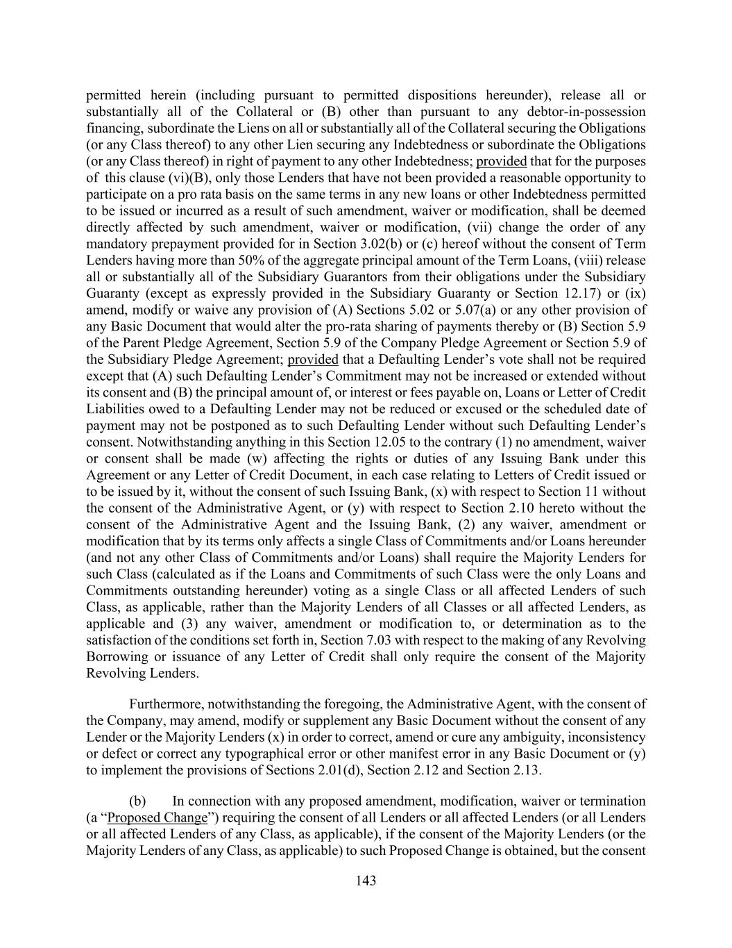 143 permitted herein (including pursuant to permitted dispositions hereunder), release all or substantially all of the Collateral or (B) other than pursuant to any debtor-in-possession financing, subordinate the Liens on all or substantially all of the Collateral securing the Obligations (or any Class thereof) to any other Lien securing any Indebtedness or subordinate the Obligations (or any Class thereof) in right of payment to any other Indebtedness; provided that for the purposes of this clause (vi)(B), only those Lenders that have not been provided a reasonable opportunity to participate on a pro rata basis on the same terms in any new loans or other Indebtedness permitted to be issued or incurred as a result of such amendment, waiver or modification, shall be deemed directly affected by such amendment, waiver or modification, (vii) change the order of any mandatory prepayment provided for in Section 3.02(b) or (c) hereof without the consent of Term Lenders having more than 50% of the aggregate principal amount of the Term Loans, (viii) release all or substantially all of the Subsidiary Guarantors from their obligations under the Subsidiary Guaranty (except as expressly provided in the Subsidiary Guaranty or Section 12.17) or (ix) amend, modify or waive any provision of (A) Sections 5.02 or 5.07(a) or any other provision of any Basic Document that would alter the pro-rata sharing of payments thereby or (B) Section 5.9 of the Parent Pledge Agreement, Section 5.9 of the Company Pledge Agreement or Section 5.9 of the Subsidiary Pledge Agreement; provided that a Defaulting Lender’s vote shall not be required except that (A) such Defaulting Lender’s Commitment may not be increased or extended without its consent and (B) the principal amount of, or interest or fees payable on, Loans or Letter of Credit Liabilities owed to a Defaulting Lender may not be reduced or excused or the scheduled date of payment may not be postponed as to such Defaulting Lender without such Defaulting Lender’s consent. Notwithstanding anything in this Section 12.05 to the contrary (1) no amendment, waiver or consent shall be made (w) affecting the rights or duties of any Issuing Bank under this Agreement or any Letter of Credit Document, in each case relating to Letters of Credit issued or to be issued by it, without the consent of such Issuing Bank, (x) with respect to Section 11 without the consent of the Administrative Agent, or (y) with respect to Section 2.10 hereto without the consent of the Administrative Agent and the Issuing Bank, (2) any waiver, amendment or modification that by its terms only affects a single Class of Commitments and/or Loans hereunder (and not any other Class of Commitments and/or Loans) shall require the Majority Lenders for such Class (calculated as if the Loans and Commitments of such Class were the only Loans and Commitments outstanding hereunder) voting as a single Class or all affected Lenders of such Class, as applicable, rather than the Majority Lenders of all Classes or all affected Lenders, as applicable and (3) any waiver, amendment or modification to, or determination as to the satisfaction of the conditions set forth in, Section 7.03 with respect to the making of any Revolving Borrowing or issuance of any Letter of Credit shall only require the consent of the Majority Revolving Lenders. Furthermore, notwithstanding the foregoing, the Administrative Agent, with the consent of the Company, may amend, modify or supplement any Basic Document without the consent of any Lender or the Majority Lenders (x) in order to correct, amend or cure any ambiguity, inconsistency or defect or correct any typographical error or other manifest error in any Basic Document or (y) to implement the provisions of Sections 2.01(d), Section 2.12 and Section 2.13. (b) In connection with any proposed amendment, modification, waiver or termination (a “Proposed Change”) requiring the consent of all Lenders or all affected Lenders (or all Lenders or all affected Lenders of any Class, as applicable), if the consent of the Majority Lenders (or the Majority Lenders of any Class, as applicable) to such Proposed Change is obtained, but the consent