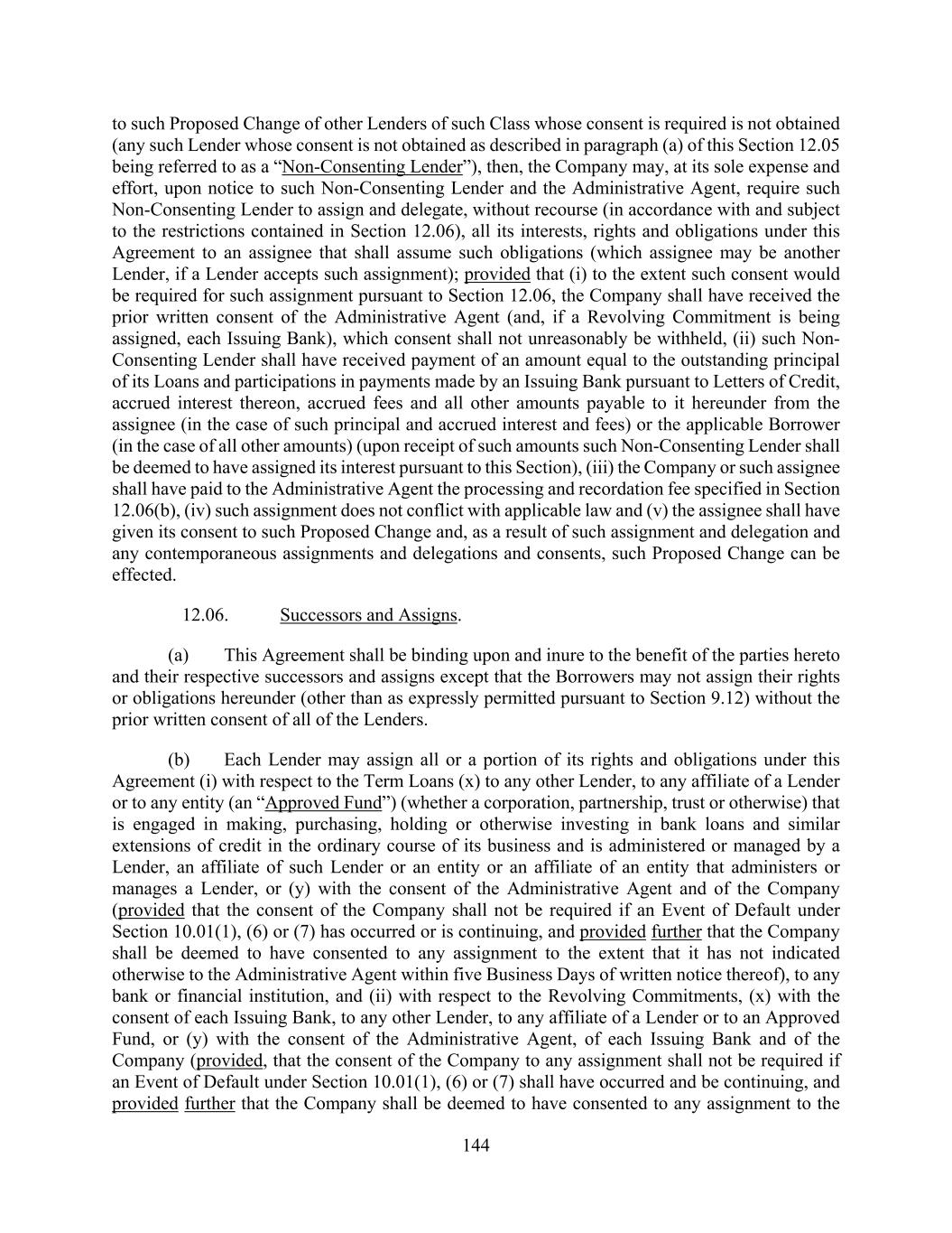 144 to such Proposed Change of other Lenders of such Class whose consent is required is not obtained (any such Lender whose consent is not obtained as described in paragraph (a) of this Section 12.05 being referred to as a “Non-Consenting Lender”), then, the Company may, at its sole expense and effort, upon notice to such Non-Consenting Lender and the Administrative Agent, require such Non-Consenting Lender to assign and delegate, without recourse (in accordance with and subject to the restrictions contained in Section 12.06), all its interests, rights and obligations under this Agreement to an assignee that shall assume such obligations (which assignee may be another Lender, if a Lender accepts such assignment); provided that (i) to the extent such consent would be required for such assignment pursuant to Section 12.06, the Company shall have received the prior written consent of the Administrative Agent (and, if a Revolving Commitment is being assigned, each Issuing Bank), which consent shall not unreasonably be withheld, (ii) such Non- Consenting Lender shall have received payment of an amount equal to the outstanding principal of its Loans and participations in payments made by an Issuing Bank pursuant to Letters of Credit, accrued interest thereon, accrued fees and all other amounts payable to it hereunder from the assignee (in the case of such principal and accrued interest and fees) or the applicable Borrower (in the case of all other amounts) (upon receipt of such amounts such Non-Consenting Lender shall be deemed to have assigned its interest pursuant to this Section), (iii) the Company or such assignee shall have paid to the Administrative Agent the processing and recordation fee specified in Section 12.06(b), (iv) such assignment does not conflict with applicable law and (v) the assignee shall have given its consent to such Proposed Change and, as a result of such assignment and delegation and any contemporaneous assignments and delegations and consents, such Proposed Change can be effected. 12.06. Successors and Assigns. (a) This Agreement shall be binding upon and inure to the benefit of the parties hereto and their respective successors and assigns except that the Borrowers may not assign their rights or obligations hereunder (other than as expressly permitted pursuant to Section 9.12) without the prior written consent of all of the Lenders. (b) Each Lender may assign all or a portion of its rights and obligations under this Agreement (i) with respect to the Term Loans (x) to any other Lender, to any affiliate of a Lender or to any entity (an “Approved Fund”) (whether a corporation, partnership, trust or otherwise) that is engaged in making, purchasing, holding or otherwise investing in bank loans and similar extensions of credit in the ordinary course of its business and is administered or managed by a Lender, an affiliate of such Lender or an entity or an affiliate of an entity that administers or manages a Lender, or (y) with the consent of the Administrative Agent and of the Company (provided that the consent of the Company shall not be required if an Event of Default under Section 10.01(1), (6) or (7) has occurred or is continuing, and provided further that the Company shall be deemed to have consented to any assignment to the extent that it has not indicated otherwise to the Administrative Agent within five Business Days of written notice thereof), to any bank or financial institution, and (ii) with respect to the Revolving Commitments, (x) with the consent of each Issuing Bank, to any other Lender, to any affiliate of a Lender or to an Approved Fund, or (y) with the consent of the Administrative Agent, of each Issuing Bank and of the Company (provided, that the consent of the Company to any assignment shall not be required if an Event of Default under Section 10.01(1), (6) or (7) shall have occurred and be continuing, and provided further that the Company shall be deemed to have consented to any assignment to the