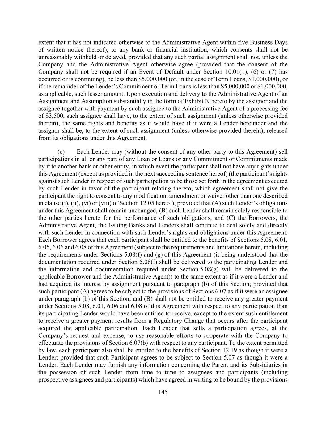 145 extent that it has not indicated otherwise to the Administrative Agent within five Business Days of written notice thereof), to any bank or financial institution, which consents shall not be unreasonably withheld or delayed, provided that any such partial assignment shall not, unless the Company and the Administrative Agent otherwise agree (provided that the consent of the Company shall not be required if an Event of Default under Section 10.01(1), (6) or (7) has occurred or is continuing), be less than $5,000,000 (or, in the case of Term Loans, $1,000,000), or if the remainder of the Lender’s Commitment or Term Loans is less than $5,000,000 or $1,000,000, as applicable, such lesser amount. Upon execution and delivery to the Administrative Agent of an Assignment and Assumption substantially in the form of Exhibit N hereto by the assignor and the assignee together with payment by such assignee to the Administrative Agent of a processing fee of $3,500, such assignee shall have, to the extent of such assignment (unless otherwise provided therein), the same rights and benefits as it would have if it were a Lender hereunder and the assignor shall be, to the extent of such assignment (unless otherwise provided therein), released from its obligations under this Agreement. (c) Each Lender may (without the consent of any other party to this Agreement) sell participations in all or any part of any Loan or Loans or any Commitment or Commitments made by it to another bank or other entity, in which event the participant shall not have any rights under this Agreement (except as provided in the next succeeding sentence hereof) (the participant’s rights against such Lender in respect of such participation to be those set forth in the agreement executed by such Lender in favor of the participant relating thereto, which agreement shall not give the participant the right to consent to any modification, amendment or waiver other than one described in clause (i), (ii), (vi) or (viii) of Section 12.05 hereof); provided that (A) such Lender’s obligations under this Agreement shall remain unchanged, (B) such Lender shall remain solely responsible to the other parties hereto for the performance of such obligations, and (C) the Borrowers, the Administrative Agent, the Issuing Banks and Lenders shall continue to deal solely and directly with such Lender in connection with such Lender’s rights and obligations under this Agreement. Each Borrower agrees that each participant shall be entitled to the benefits of Sections 5.08, 6.01, 6.05, 6.06 and 6.08 of this Agreement (subject to the requirements and limitations herein, including the requirements under Sections 5.08(f) and (g) of this Agreement (it being understood that the documentation required under Section 5.08(f) shall be delivered to the participating Lender and the information and documentation required under Section 5.08(g) will be delivered to the applicable Borrower and the Administrative Agent)) to the same extent as if it were a Lender and had acquired its interest by assignment pursuant to paragraph (b) of this Section; provided that such participant (A) agrees to be subject to the provisions of Sections 6.07 as if it were an assignee under paragraph (b) of this Section; and (B) shall not be entitled to receive any greater payment under Sections 5.08, 6.01, 6.06 and 6.08 of this Agreement with respect to any participation than its participating Lender would have been entitled to receive, except to the extent such entitlement to receive a greater payment results from a Regulatory Change that occurs after the participant acquired the applicable participation. Each Lender that sells a participation agrees, at the Company’s request and expense, to use reasonable efforts to cooperate with the Company to effectuate the provisions of Section 6.07(b) with respect to any participant. To the extent permitted by law, each participant also shall be entitled to the benefits of Section 12.19 as though it were a Lender; provided that such Participant agrees to be subject to Section 5.07 as though it were a Lender. Each Lender may furnish any information concerning the Parent and its Subsidiaries in the possession of such Lender from time to time to assignees and participants (including prospective assignees and participants) which have agreed in writing to be bound by the provisions