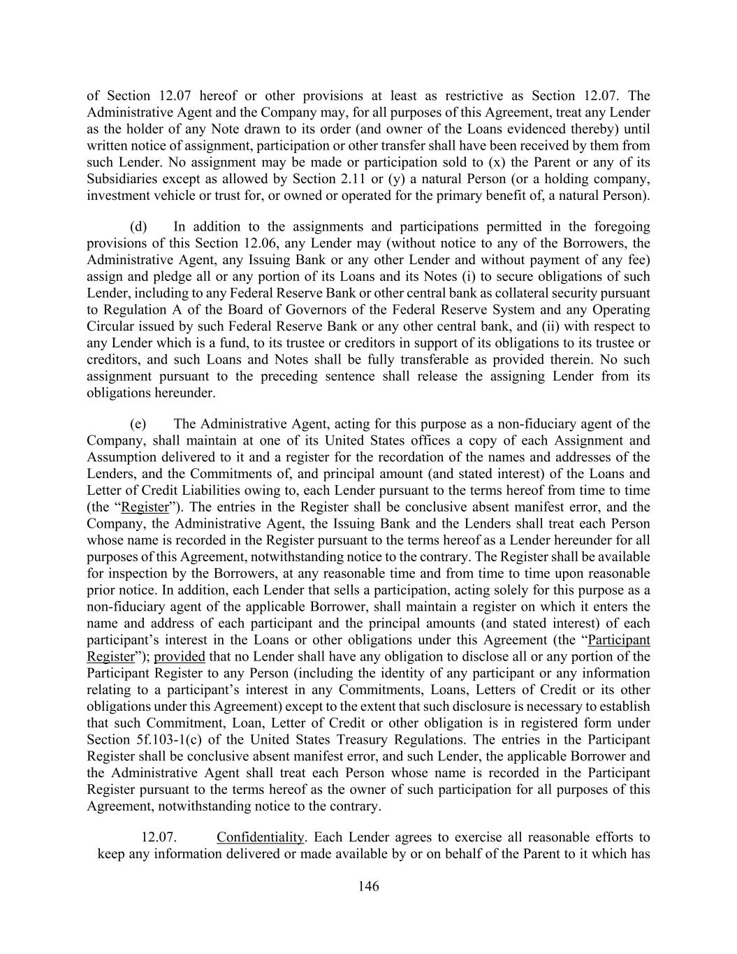 146 of Section 12.07 hereof or other provisions at least as restrictive as Section 12.07. The Administrative Agent and the Company may, for all purposes of this Agreement, treat any Lender as the holder of any Note drawn to its order (and owner of the Loans evidenced thereby) until written notice of assignment, participation or other transfer shall have been received by them from such Lender. No assignment may be made or participation sold to (x) the Parent or any of its Subsidiaries except as allowed by Section 2.11 or (y) a natural Person (or a holding company, investment vehicle or trust for, or owned or operated for the primary benefit of, a natural Person). (d) In addition to the assignments and participations permitted in the foregoing provisions of this Section 12.06, any Lender may (without notice to any of the Borrowers, the Administrative Agent, any Issuing Bank or any other Lender and without payment of any fee) assign and pledge all or any portion of its Loans and its Notes (i) to secure obligations of such Lender, including to any Federal Reserve Bank or other central bank as collateral security pursuant to Regulation A of the Board of Governors of the Federal Reserve System and any Operating Circular issued by such Federal Reserve Bank or any other central bank, and (ii) with respect to any Lender which is a fund, to its trustee or creditors in support of its obligations to its trustee or creditors, and such Loans and Notes shall be fully transferable as provided therein. No such assignment pursuant to the preceding sentence shall release the assigning Lender from its obligations hereunder. (e) The Administrative Agent, acting for this purpose as a non-fiduciary agent of the Company, shall maintain at one of its United States offices a copy of each Assignment and Assumption delivered to it and a register for the recordation of the names and addresses of the Lenders, and the Commitments of, and principal amount (and stated interest) of the Loans and Letter of Credit Liabilities owing to, each Lender pursuant to the terms hereof from time to time (the “Register”). The entries in the Register shall be conclusive absent manifest error, and the Company, the Administrative Agent, the Issuing Bank and the Lenders shall treat each Person whose name is recorded in the Register pursuant to the terms hereof as a Lender hereunder for all purposes of this Agreement, notwithstanding notice to the contrary. The Register shall be available for inspection by the Borrowers, at any reasonable time and from time to time upon reasonable prior notice. In addition, each Lender that sells a participation, acting solely for this purpose as a non-fiduciary agent of the applicable Borrower, shall maintain a register on which it enters the name and address of each participant and the principal amounts (and stated interest) of each participant’s interest in the Loans or other obligations under this Agreement (the “Participant Register”); provided that no Lender shall have any obligation to disclose all or any portion of the Participant Register to any Person (including the identity of any participant or any information relating to a participant’s interest in any Commitments, Loans, Letters of Credit or its other obligations under this Agreement) except to the extent that such disclosure is necessary to establish that such Commitment, Loan, Letter of Credit or other obligation is in registered form under Section 5f.103-1(c) of the United States Treasury Regulations. The entries in the Participant Register shall be conclusive absent manifest error, and such Lender, the applicable Borrower and the Administrative Agent shall treat each Person whose name is recorded in the Participant Register pursuant to the terms hereof as the owner of such participation for all purposes of this Agreement, notwithstanding notice to the contrary. 12.07. Confidentiality. Each Lender agrees to exercise all reasonable efforts to keep any information delivered or made available by or on behalf of the Parent to it which has