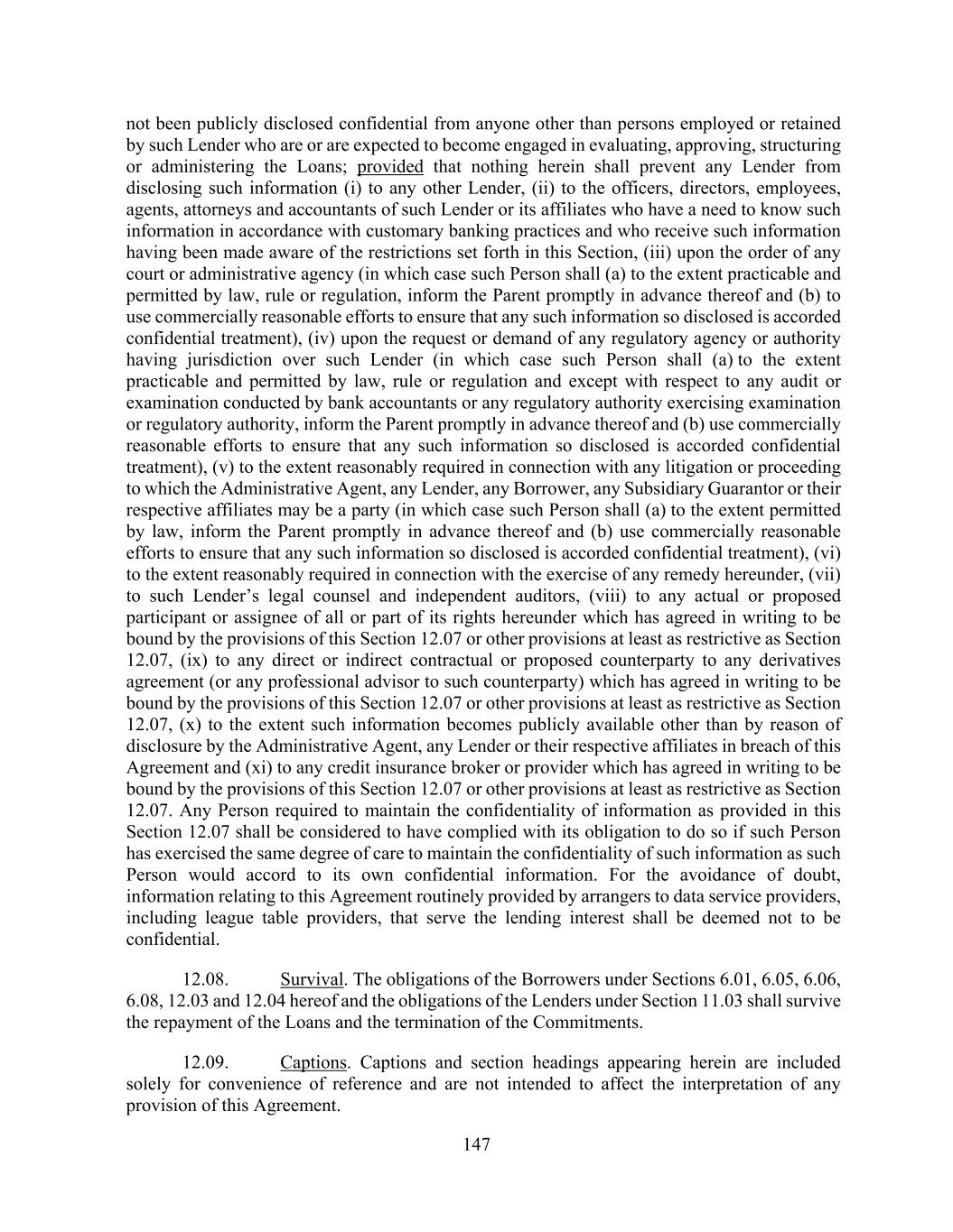 147 not been publicly disclosed confidential from anyone other than persons employed or retained by such Lender who are or are expected to become engaged in evaluating, approving, structuring or administering the Loans; provided that nothing herein shall prevent any Lender from disclosing such information (i) to any other Lender, (ii) to the officers, directors, employees, agents, attorneys and accountants of such Lender or its affiliates who have a need to know such information in accordance with customary banking practices and who receive such information having been made aware of the restrictions set forth in this Section, (iii) upon the order of any court or administrative agency (in which case such Person shall (a) to the extent practicable and permitted by law, rule or regulation, inform the Parent promptly in advance thereof and (b) to use commercially reasonable efforts to ensure that any such information so disclosed is accorded confidential treatment), (iv) upon the request or demand of any regulatory agency or authority having jurisdiction over such Lender (in which case such Person shall (a) to the extent practicable and permitted by law, rule or regulation and except with respect to any audit or examination conducted by bank accountants or any regulatory authority exercising examination or regulatory authority, inform the Parent promptly in advance thereof and (b) use commercially reasonable efforts to ensure that any such information so disclosed is accorded confidential treatment), (v) to the extent reasonably required in connection with any litigation or proceeding to which the Administrative Agent, any Lender, any Borrower, any Subsidiary Guarantor or their respective affiliates may be a party (in which case such Person shall (a) to the extent permitted by law, inform the Parent promptly in advance thereof and (b) use commercially reasonable efforts to ensure that any such information so disclosed is accorded confidential treatment), (vi) to the extent reasonably required in connection with the exercise of any remedy hereunder, (vii) to such Lender’s legal counsel and independent auditors, (viii) to any actual or proposed participant or assignee of all or part of its rights hereunder which has agreed in writing to be bound by the provisions of this Section 12.07 or other provisions at least as restrictive as Section 12.07, (ix) to any direct or indirect contractual or proposed counterparty to any derivatives agreement (or any professional advisor to such counterparty) which has agreed in writing to be bound by the provisions of this Section 12.07 or other provisions at least as restrictive as Section 12.07, (x) to the extent such information becomes publicly available other than by reason of disclosure by the Administrative Agent, any Lender or their respective affiliates in breach of this Agreement and (xi) to any credit insurance broker or provider which has agreed in writing to be bound by the provisions of this Section 12.07 or other provisions at least as restrictive as Section 12.07. Any Person required to maintain the confidentiality of information as provided in this Section 12.07 shall be considered to have complied with its obligation to do so if such Person has exercised the same degree of care to maintain the confidentiality of such information as such Person would accord to its own confidential information. For the avoidance of doubt, information relating to this Agreement routinely provided by arrangers to data service providers, including league table providers, that serve the lending interest shall be deemed not to be confidential. 12.08. Survival. The obligations of the Borrowers under Sections 6.01, 6.05, 6.06, 6.08, 12.03 and 12.04 hereof and the obligations of the Lenders under Section 11.03 shall survive the repayment of the Loans and the termination of the Commitments. 12.09. Captions. Captions and section headings appearing herein are included solely for convenience of reference and are not intended to affect the interpretation of any provision of this Agreement.
