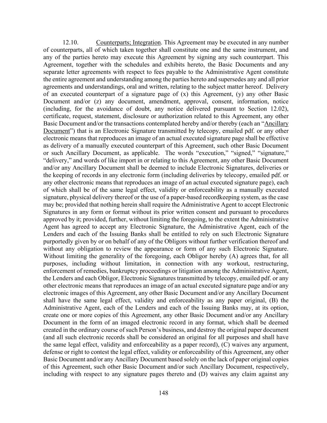 148 12.10. Counterparts; Integration. This Agreement may be executed in any number of counterparts, all of which taken together shall constitute one and the same instrument, and any of the parties hereto may execute this Agreement by signing any such counterpart. This Agreement, together with the schedules and exhibits hereto, the Basic Documents and any separate letter agreements with respect to fees payable to the Administrative Agent constitute the entire agreement and understanding among the parties hereto and supersedes any and all prior agreements and understandings, oral and written, relating to the subject matter hereof. Delivery of an executed counterpart of a signature page of (x) this Agreement, (y) any other Basic Document and/or (z) any document, amendment, approval, consent, information, notice (including, for the avoidance of doubt, any notice delivered pursuant to Section 12.02), certificate, request, statement, disclosure or authorization related to this Agreement, any other Basic Document and/or the transactions contemplated hereby and/or thereby (each an “Ancillary Document”) that is an Electronic Signature transmitted by telecopy, emailed pdf. or any other electronic means that reproduces an image of an actual executed signature page shall be effective as delivery of a manually executed counterpart of this Agreement, such other Basic Document or such Ancillary Document, as applicable. The words “execution,” “signed,” “signature,” “delivery,” and words of like import in or relating to this Agreement, any other Basic Document and/or any Ancillary Document shall be deemed to include Electronic Signatures, deliveries or the keeping of records in any electronic form (including deliveries by telecopy, emailed pdf. or any other electronic means that reproduces an image of an actual executed signature page), each of which shall be of the same legal effect, validity or enforceability as a manually executed signature, physical delivery thereof or the use of a paper-based recordkeeping system, as the case may be; provided that nothing herein shall require the Administrative Agent to accept Electronic Signatures in any form or format without its prior written consent and pursuant to procedures approved by it; provided, further, without limiting the foregoing, to the extent the Administrative Agent has agreed to accept any Electronic Signature, the Administrative Agent, each of the Lenders and each of the Issuing Banks shall be entitled to rely on such Electronic Signature purportedly given by or on behalf of any of the Obligors without further verification thereof and without any obligation to review the appearance or form of any such Electronic Signature. Without limiting the generality of the foregoing, each Obligor hereby (A) agrees that, for all purposes, including without limitation, in connection with any workout, restructuring, enforcement of remedies, bankruptcy proceedings or litigation among the Administrative Agent, the Lenders and each Obligor, Electronic Signatures transmitted by telecopy, emailed pdf. or any other electronic means that reproduces an image of an actual executed signature page and/or any electronic images of this Agreement, any other Basic Document and/or any Ancillary Document shall have the same legal effect, validity and enforceability as any paper original, (B) the Administrative Agent, each of the Lenders and each of the Issuing Banks may, at its option, create one or more copies of this Agreement, any other Basic Document and/or any Ancillary Document in the form of an imaged electronic record in any format, which shall be deemed created in the ordinary course of such Person’s business, and destroy the original paper document (and all such electronic records shall be considered an original for all purposes and shall have the same legal effect, validity and enforceability as a paper record), (C) waives any argument, defense or right to contest the legal effect, validity or enforceability of this Agreement, any other Basic Document and/or any Ancillary Document based solely on the lack of paper original copies of this Agreement, such other Basic Document and/or such Ancillary Document, respectively, including with respect to any signature pages thereto and (D) waives any claim against any