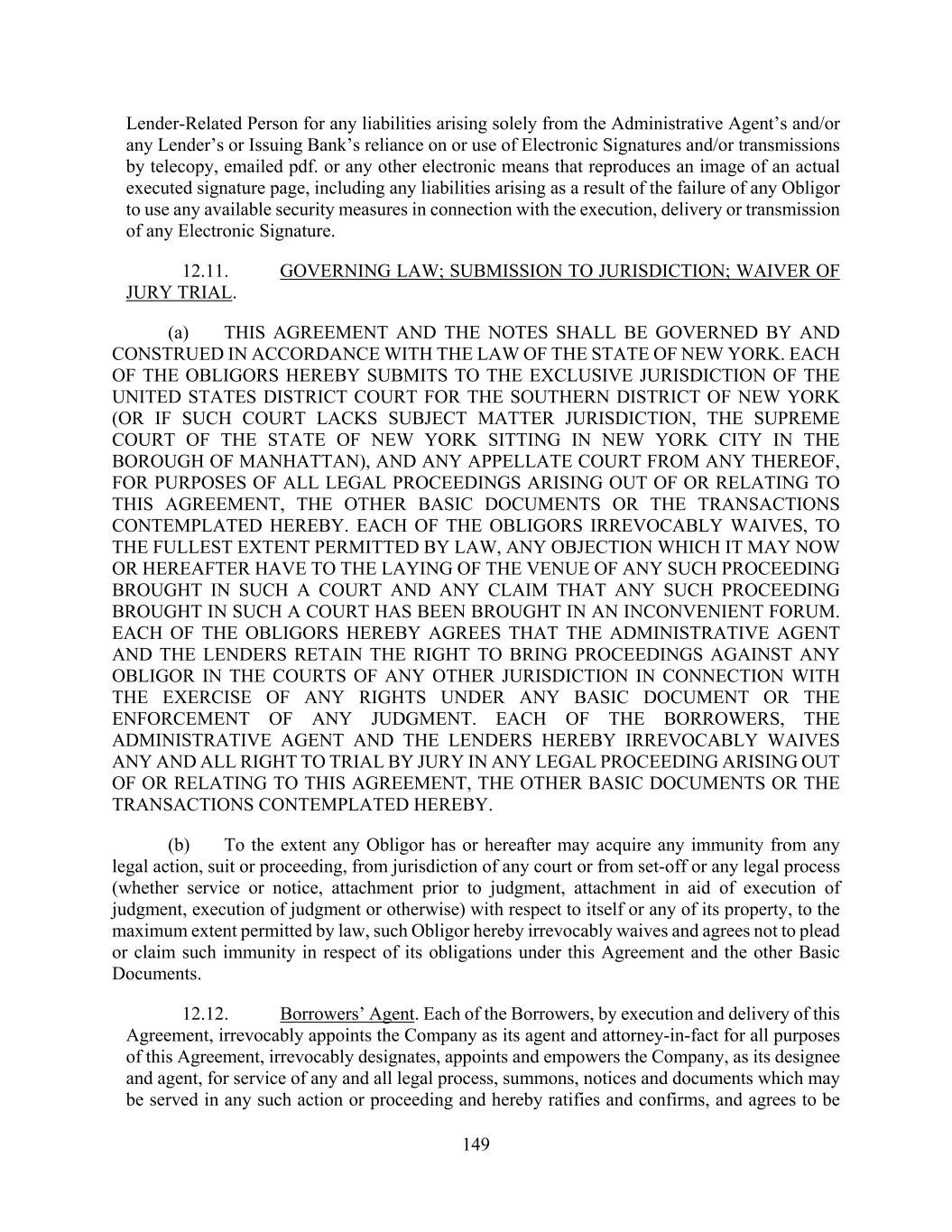 149 Lender-Related Person for any liabilities arising solely from the Administrative Agent’s and/or any Lender’s or Issuing Bank’s reliance on or use of Electronic Signatures and/or transmissions by telecopy, emailed pdf. or any other electronic means that reproduces an image of an actual executed signature page, including any liabilities arising as a result of the failure of any Obligor to use any available security measures in connection with the execution, delivery or transmission of any Electronic Signature. 12.11. GOVERNING LAW; SUBMISSION TO JURISDICTION; WAIVER OF JURY TRIAL. (a) THIS AGREEMENT AND THE NOTES SHALL BE GOVERNED BY AND CONSTRUED IN ACCORDANCE WITH THE LAW OF THE STATE OF NEW YORK. EACH OF THE OBLIGORS HEREBY SUBMITS TO THE EXCLUSIVE JURISDICTION OF THE UNITED STATES DISTRICT COURT FOR THE SOUTHERN DISTRICT OF NEW YORK (OR IF SUCH COURT LACKS SUBJECT MATTER JURISDICTION, THE SUPREME COURT OF THE STATE OF NEW YORK SITTING IN NEW YORK CITY IN THE BOROUGH OF MANHATTAN), AND ANY APPELLATE COURT FROM ANY THEREOF, FOR PURPOSES OF ALL LEGAL PROCEEDINGS ARISING OUT OF OR RELATING TO THIS AGREEMENT, THE OTHER BASIC DOCUMENTS OR THE TRANSACTIONS CONTEMPLATED HEREBY. EACH OF THE OBLIGORS IRREVOCABLY WAIVES, TO THE FULLEST EXTENT PERMITTED BY LAW, ANY OBJECTION WHICH IT MAY NOW OR HEREAFTER HAVE TO THE LAYING OF THE VENUE OF ANY SUCH PROCEEDING BROUGHT IN SUCH A COURT AND ANY CLAIM THAT ANY SUCH PROCEEDING BROUGHT IN SUCH A COURT HAS BEEN BROUGHT IN AN INCONVENIENT FORUM. EACH OF THE OBLIGORS HEREBY AGREES THAT THE ADMINISTRATIVE AGENT AND THE LENDERS RETAIN THE RIGHT TO BRING PROCEEDINGS AGAINST ANY OBLIGOR IN THE COURTS OF ANY OTHER JURISDICTION IN CONNECTION WITH THE EXERCISE OF ANY RIGHTS UNDER ANY BASIC DOCUMENT OR THE ENFORCEMENT OF ANY JUDGMENT. EACH OF THE BORROWERS, THE ADMINISTRATIVE AGENT AND THE LENDERS HEREBY IRREVOCABLY WAIVES ANY AND ALL RIGHT TO TRIAL BY JURY IN ANY LEGAL PROCEEDING ARISING OUT OF OR RELATING TO THIS AGREEMENT, THE OTHER BASIC DOCUMENTS OR THE TRANSACTIONS CONTEMPLATED HEREBY. (b) To the extent any Obligor has or hereafter may acquire any immunity from any legal action, suit or proceeding, from jurisdiction of any court or from set-off or any legal process (whether service or notice, attachment prior to judgment, attachment in aid of execution of judgment, execution of judgment or otherwise) with respect to itself or any of its property, to the maximum extent permitted by law, such Obligor hereby irrevocably waives and agrees not to plead or claim such immunity in respect of its obligations under this Agreement and the other Basic Documents. 12.12. Borrowers’ Agent. Each of the Borrowers, by execution and delivery of this Agreement, irrevocably appoints the Company as its agent and attorney-in-fact for all purposes of this Agreement, irrevocably designates, appoints and empowers the Company, as its designee and agent, for service of any and all legal process, summons, notices and documents which may be served in any such action or proceeding and hereby ratifies and confirms, and agrees to be