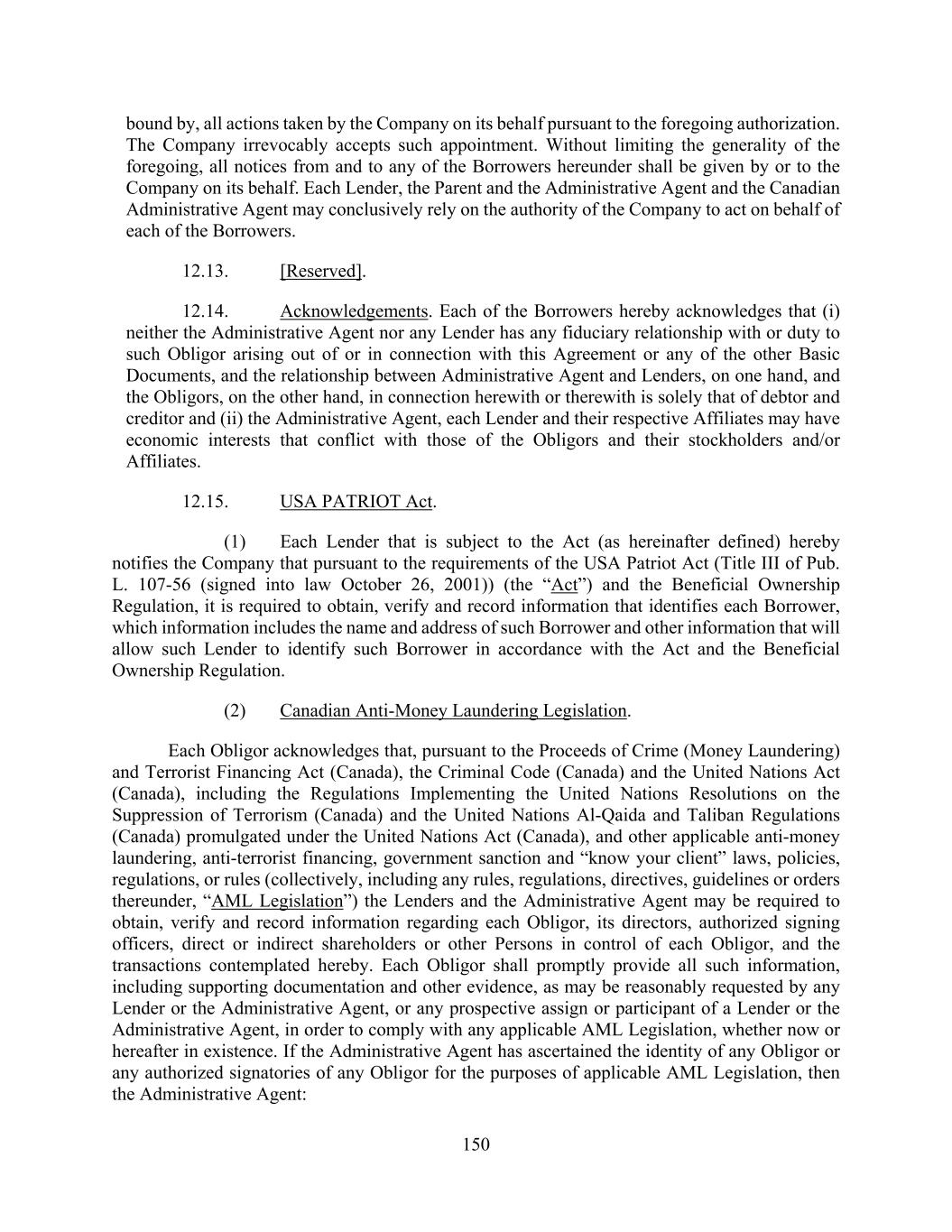 150 bound by, all actions taken by the Company on its behalf pursuant to the foregoing authorization. The Company irrevocably accepts such appointment. Without limiting the generality of the foregoing, all notices from and to any of the Borrowers hereunder shall be given by or to the Company on its behalf. Each Lender, the Parent and the Administrative Agent and the Canadian Administrative Agent may conclusively rely on the authority of the Company to act on behalf of each of the Borrowers. 12.13. [Reserved]. 12.14. Acknowledgements. Each of the Borrowers hereby acknowledges that (i) neither the Administrative Agent nor any Lender has any fiduciary relationship with or duty to such Obligor arising out of or in connection with this Agreement or any of the other Basic Documents, and the relationship between Administrative Agent and Lenders, on one hand, and the Obligors, on the other hand, in connection herewith or therewith is solely that of debtor and creditor and (ii) the Administrative Agent, each Lender and their respective Affiliates may have economic interests that conflict with those of the Obligors and their stockholders and/or Affiliates. 12.15. USA PATRIOT Act. (1) Each Lender that is subject to the Act (as hereinafter defined) hereby notifies the Company that pursuant to the requirements of the USA Patriot Act (Title III of Pub. L. 107-56 (signed into law October 26, 2001)) (the “Act”) and the Beneficial Ownership Regulation, it is required to obtain, verify and record information that identifies each Borrower, which information includes the name and address of such Borrower and other information that will allow such Lender to identify such Borrower in accordance with the Act and the Beneficial Ownership Regulation. (2) Canadian Anti-Money Laundering Legislation. Each Obligor acknowledges that, pursuant to the Proceeds of Crime (Money Laundering) and Terrorist Financing Act (Canada), the Criminal Code (Canada) and the United Nations Act (Canada), including the Regulations Implementing the United Nations Resolutions on the Suppression of Terrorism (Canada) and the United Nations Al-Qaida and Taliban Regulations (Canada) promulgated under the United Nations Act (Canada), and other applicable anti-money laundering, anti-terrorist financing, government sanction and “know your client” laws, policies, regulations, or rules (collectively, including any rules, regulations, directives, guidelines or orders thereunder, “AML Legislation”) the Lenders and the Administrative Agent may be required to obtain, verify and record information regarding each Obligor, its directors, authorized signing officers, direct or indirect shareholders or other Persons in control of each Obligor, and the transactions contemplated hereby. Each Obligor shall promptly provide all such information, including supporting documentation and other evidence, as may be reasonably requested by any Lender or the Administrative Agent, or any prospective assign or participant of a Lender or the Administrative Agent, in order to comply with any applicable AML Legislation, whether now or hereafter in existence. If the Administrative Agent has ascertained the identity of any Obligor or any authorized signatories of any Obligor for the purposes of applicable AML Legislation, then the Administrative Agent: