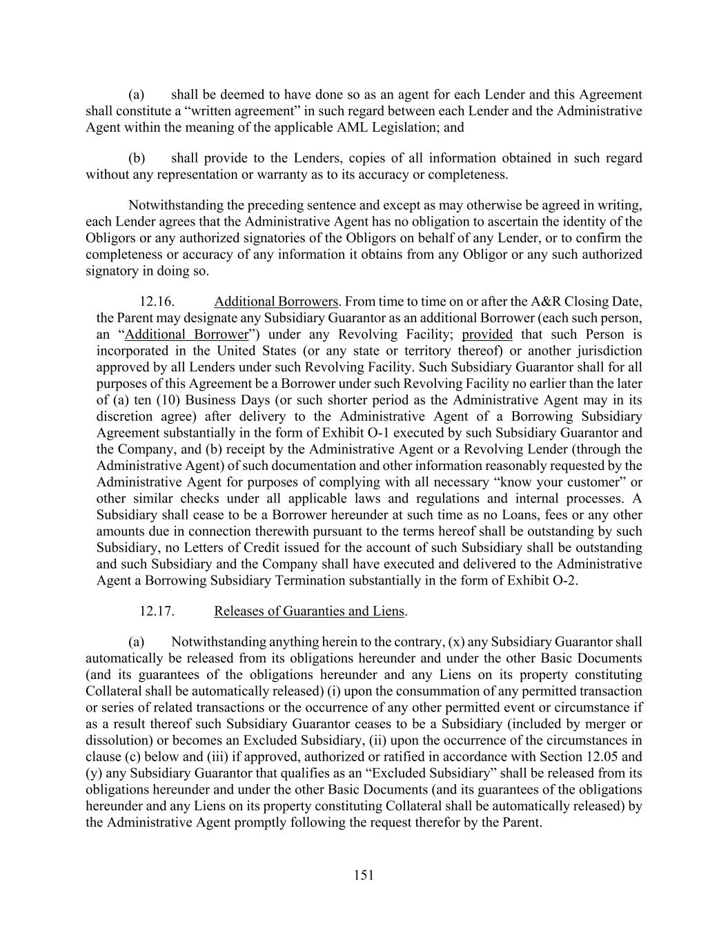 151 (a) shall be deemed to have done so as an agent for each Lender and this Agreement shall constitute a “written agreement” in such regard between each Lender and the Administrative Agent within the meaning of the applicable AML Legislation; and (b) shall provide to the Lenders, copies of all information obtained in such regard without any representation or warranty as to its accuracy or completeness. Notwithstanding the preceding sentence and except as may otherwise be agreed in writing, each Lender agrees that the Administrative Agent has no obligation to ascertain the identity of the Obligors or any authorized signatories of the Obligors on behalf of any Lender, or to confirm the completeness or accuracy of any information it obtains from any Obligor or any such authorized signatory in doing so. 12.16. Additional Borrowers. From time to time on or after the A&R Closing Date, the Parent may designate any Subsidiary Guarantor as an additional Borrower (each such person, an “Additional Borrower”) under any Revolving Facility; provided that such Person is incorporated in the United States (or any state or territory thereof) or another jurisdiction approved by all Lenders under such Revolving Facility. Such Subsidiary Guarantor shall for all purposes of this Agreement be a Borrower under such Revolving Facility no earlier than the later of (a) ten (10) Business Days (or such shorter period as the Administrative Agent may in its discretion agree) after delivery to the Administrative Agent of a Borrowing Subsidiary Agreement substantially in the form of Exhibit O-1 executed by such Subsidiary Guarantor and the Company, and (b) receipt by the Administrative Agent or a Revolving Lender (through the Administrative Agent) of such documentation and other information reasonably requested by the Administrative Agent for purposes of complying with all necessary “know your customer” or other similar checks under all applicable laws and regulations and internal processes. A Subsidiary shall cease to be a Borrower hereunder at such time as no Loans, fees or any other amounts due in connection therewith pursuant to the terms hereof shall be outstanding by such Subsidiary, no Letters of Credit issued for the account of such Subsidiary shall be outstanding and such Subsidiary and the Company shall have executed and delivered to the Administrative Agent a Borrowing Subsidiary Termination substantially in the form of Exhibit O-2. 12.17. Releases of Guaranties and Liens. (a) Notwithstanding anything herein to the contrary, (x) any Subsidiary Guarantor shall automatically be released from its obligations hereunder and under the other Basic Documents (and its guarantees of the obligations hereunder and any Liens on its property constituting Collateral shall be automatically released) (i) upon the consummation of any permitted transaction or series of related transactions or the occurrence of any other permitted event or circumstance if as a result thereof such Subsidiary Guarantor ceases to be a Subsidiary (included by merger or dissolution) or becomes an Excluded Subsidiary, (ii) upon the occurrence of the circumstances in clause (c) below and (iii) if approved, authorized or ratified in accordance with Section 12.05 and (y) any Subsidiary Guarantor that qualifies as an “Excluded Subsidiary” shall be released from its obligations hereunder and under the other Basic Documents (and its guarantees of the obligations hereunder and any Liens on its property constituting Collateral shall be automatically released) by the Administrative Agent promptly following the request therefor by the Parent.