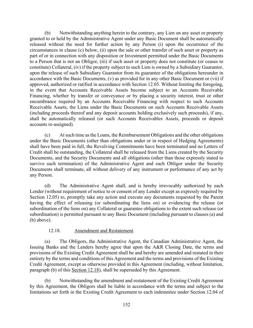 152 (b) Notwithstanding anything herein to the contrary, any Lien on any asset or property granted to or held by the Administrative Agent under any Basic Document shall be automatically released without the need for further action by any Person (i) upon the occurrence of the circumstances in clause (c) below, (ii) upon the sale or other transfer of such asset or property as part of or in connection with any disposition or Investment permitted under the Basic Documents to a Person that is not an Obligor, (iii) if such asset or property does not constitute (or ceases to constitute) Collateral, (iv) if the property subject to such Lien is owned by a Subsidiary Guarantor, upon the release of such Subsidiary Guarantor from its guarantee of the obligations hereunder in accordance with the Basic Documents, (v) as provided for in any other Basic Document or (vii) if approved, authorized or ratified in accordance with Section 12.05. Without limiting the foregoing, in the event that Accounts Receivable Assets become subject to an Accounts Receivable Financing, whether by transfer or conveyance or by placing a security interest, trust or other encumbrance required by an Accounts Receivable Financing with respect to such Accounts Receivable Assets, the Liens under the Basic Documents on such Accounts Receivable Assets (including proceeds thereof and any deposit accounts holding exclusively such proceeds), if any, shall be automatically released (or such Accounts Receivables Assets, proceeds or deposit accounts re-assigned). (c) At such time as the Loans, the Reimbursement Obligations and the other obligations under the Basic Documents (other than obligations under or in respect of Hedging Agreements) shall have been paid in full, the Revolving Commitments have been terminated and no Letters of Credit shall be outstanding, the Collateral shall be released from the Liens created by the Security Documents, and the Security Documents and all obligations (other than those expressly stated to survive such termination) of the Administrative Agent and each Obligor under the Security Documents shall terminate, all without delivery of any instrument or performance of any act by any Person. (d) The Administrative Agent shall, and is hereby irrevocably authorized by each Lender (without requirement of notice to or consent of any Lender except as expressly required by Section 12.05) to, promptly take any action and execute any documents requested by the Parent having the effect of releasing (or subordinating the liens on) or evidencing the release (or subordination of the liens on) any Collateral or guarantee obligations to the extent such release (or subordination) is permitted pursuant to any Basic Document (including pursuant to clauses (a) and (b) above). 12.18. Amendment and Restatement. (a) The Obligors, the Administrative Agent, the Canadian Administrative Agent, the Issuing Banks and the Lenders hereby agree that upon the A&R Closing Date, the terms and provisions of the Existing Credit Agreement shall be and hereby are amended and restated in their entirety by the terms and conditions of this Agreement and the terms and provisions of the Existing Credit Agreement, except as otherwise provided in this Agreement (including, without limitation, paragraph (b) of this Section 12.18), shall be superseded by this Agreement. (b) Notwithstanding the amendment and restatement of the Existing Credit Agreement by this Agreement, the Obligors shall be liable in accordance with the terms and subject to the limitations set forth in the Existing Credit Agreement to each indemnitee under Section 12.04 of