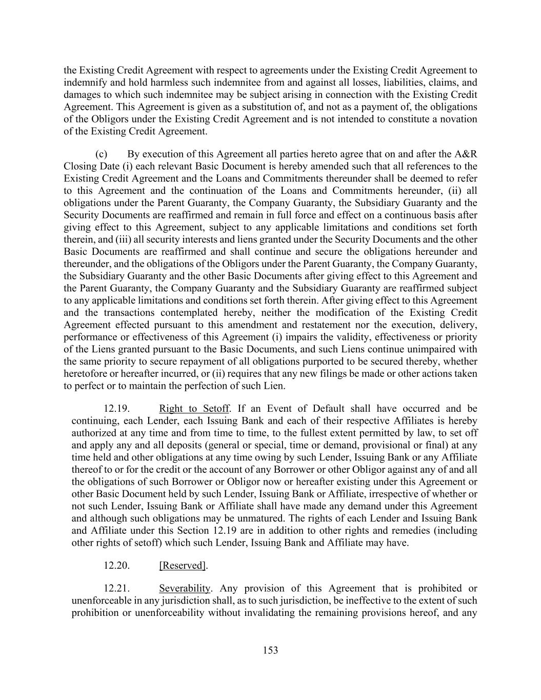 153 the Existing Credit Agreement with respect to agreements under the Existing Credit Agreement to indemnify and hold harmless such indemnitee from and against all losses, liabilities, claims, and damages to which such indemnitee may be subject arising in connection with the Existing Credit Agreement. This Agreement is given as a substitution of, and not as a payment of, the obligations of the Obligors under the Existing Credit Agreement and is not intended to constitute a novation of the Existing Credit Agreement. (c) By execution of this Agreement all parties hereto agree that on and after the A&R Closing Date (i) each relevant Basic Document is hereby amended such that all references to the Existing Credit Agreement and the Loans and Commitments thereunder shall be deemed to refer to this Agreement and the continuation of the Loans and Commitments hereunder, (ii) all obligations under the Parent Guaranty, the Company Guaranty, the Subsidiary Guaranty and the Security Documents are reaffirmed and remain in full force and effect on a continuous basis after giving effect to this Agreement, subject to any applicable limitations and conditions set forth therein, and (iii) all security interests and liens granted under the Security Documents and the other Basic Documents are reaffirmed and shall continue and secure the obligations hereunder and thereunder, and the obligations of the Obligors under the Parent Guaranty, the Company Guaranty, the Subsidiary Guaranty and the other Basic Documents after giving effect to this Agreement and the Parent Guaranty, the Company Guaranty and the Subsidiary Guaranty are reaffirmed subject to any applicable limitations and conditions set forth therein. After giving effect to this Agreement and the transactions contemplated hereby, neither the modification of the Existing Credit Agreement effected pursuant to this amendment and restatement nor the execution, delivery, performance or effectiveness of this Agreement (i) impairs the validity, effectiveness or priority of the Liens granted pursuant to the Basic Documents, and such Liens continue unimpaired with the same priority to secure repayment of all obligations purported to be secured thereby, whether heretofore or hereafter incurred, or (ii) requires that any new filings be made or other actions taken to perfect or to maintain the perfection of such Lien. 12.19. Right to Setoff. If an Event of Default shall have occurred and be continuing, each Lender, each Issuing Bank and each of their respective Affiliates is hereby authorized at any time and from time to time, to the fullest extent permitted by law, to set off and apply any and all deposits (general or special, time or demand, provisional or final) at any time held and other obligations at any time owing by such Lender, Issuing Bank or any Affiliate thereof to or for the credit or the account of any Borrower or other Obligor against any of and all the obligations of such Borrower or Obligor now or hereafter existing under this Agreement or other Basic Document held by such Lender, Issuing Bank or Affiliate, irrespective of whether or not such Lender, Issuing Bank or Affiliate shall have made any demand under this Agreement and although such obligations may be unmatured. The rights of each Lender and Issuing Bank and Affiliate under this Section 12.19 are in addition to other rights and remedies (including other rights of setoff) which such Lender, Issuing Bank and Affiliate may have. 12.20. [Reserved]. 12.21. Severability. Any provision of this Agreement that is prohibited or unenforceable in any jurisdiction shall, as to such jurisdiction, be ineffective to the extent of such prohibition or unenforceability without invalidating the remaining provisions hereof, and any