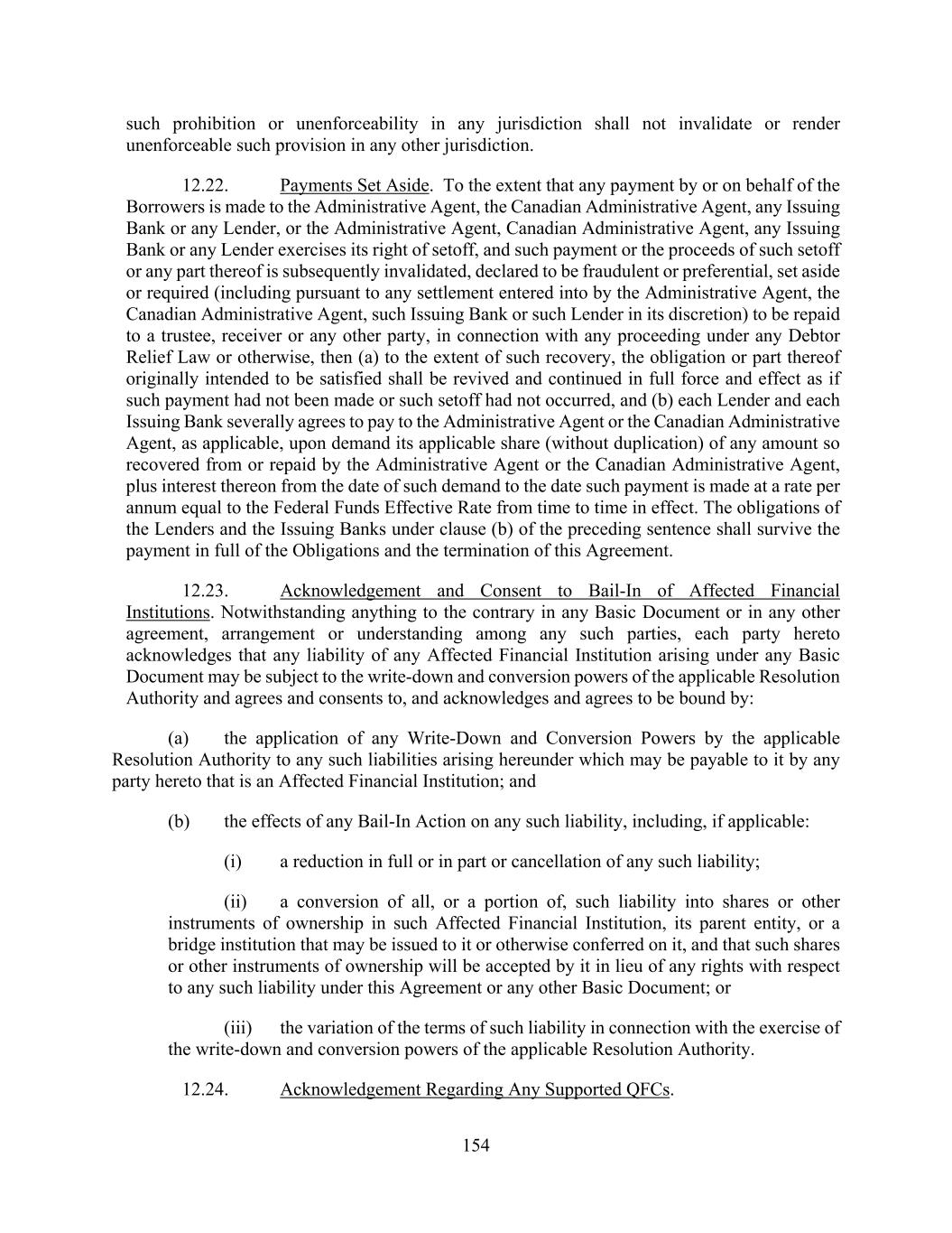 154 such prohibition or unenforceability in any jurisdiction shall not invalidate or render unenforceable such provision in any other jurisdiction. 12.22. Payments Set Aside. To the extent that any payment by or on behalf of the Borrowers is made to the Administrative Agent, the Canadian Administrative Agent, any Issuing Bank or any Lender, or the Administrative Agent, Canadian Administrative Agent, any Issuing Bank or any Lender exercises its right of setoff, and such payment or the proceeds of such setoff or any part thereof is subsequently invalidated, declared to be fraudulent or preferential, set aside or required (including pursuant to any settlement entered into by the Administrative Agent, the Canadian Administrative Agent, such Issuing Bank or such Lender in its discretion) to be repaid to a trustee, receiver or any other party, in connection with any proceeding under any Debtor Relief Law or otherwise, then (a) to the extent of such recovery, the obligation or part thereof originally intended to be satisfied shall be revived and continued in full force and effect as if such payment had not been made or such setoff had not occurred, and (b) each Lender and each Issuing Bank severally agrees to pay to the Administrative Agent or the Canadian Administrative Agent, as applicable, upon demand its applicable share (without duplication) of any amount so recovered from or repaid by the Administrative Agent or the Canadian Administrative Agent, plus interest thereon from the date of such demand to the date such payment is made at a rate per annum equal to the Federal Funds Effective Rate from time to time in effect. The obligations of the Lenders and the Issuing Banks under clause (b) of the preceding sentence shall survive the payment in full of the Obligations and the termination of this Agreement. 12.23. Acknowledgement and Consent to Bail-In of Affected Financial Institutions. Notwithstanding anything to the contrary in any Basic Document or in any other agreement, arrangement or understanding among any such parties, each party hereto acknowledges that any liability of any Affected Financial Institution arising under any Basic Document may be subject to the write-down and conversion powers of the applicable Resolution Authority and agrees and consents to, and acknowledges and agrees to be bound by: (a) the application of any Write-Down and Conversion Powers by the applicable Resolution Authority to any such liabilities arising hereunder which may be payable to it by any party hereto that is an Affected Financial Institution; and (b) the effects of any Bail-In Action on any such liability, including, if applicable: (i) a reduction in full or in part or cancellation of any such liability; (ii) a conversion of all, or a portion of, such liability into shares or other instruments of ownership in such Affected Financial Institution, its parent entity, or a bridge institution that may be issued to it or otherwise conferred on it, and that such shares or other instruments of ownership will be accepted by it in lieu of any rights with respect to any such liability under this Agreement or any other Basic Document; or (iii) the variation of the terms of such liability in connection with the exercise of the write-down and conversion powers of the applicable Resolution Authority. 12.24. Acknowledgement Regarding Any Supported QFCs.