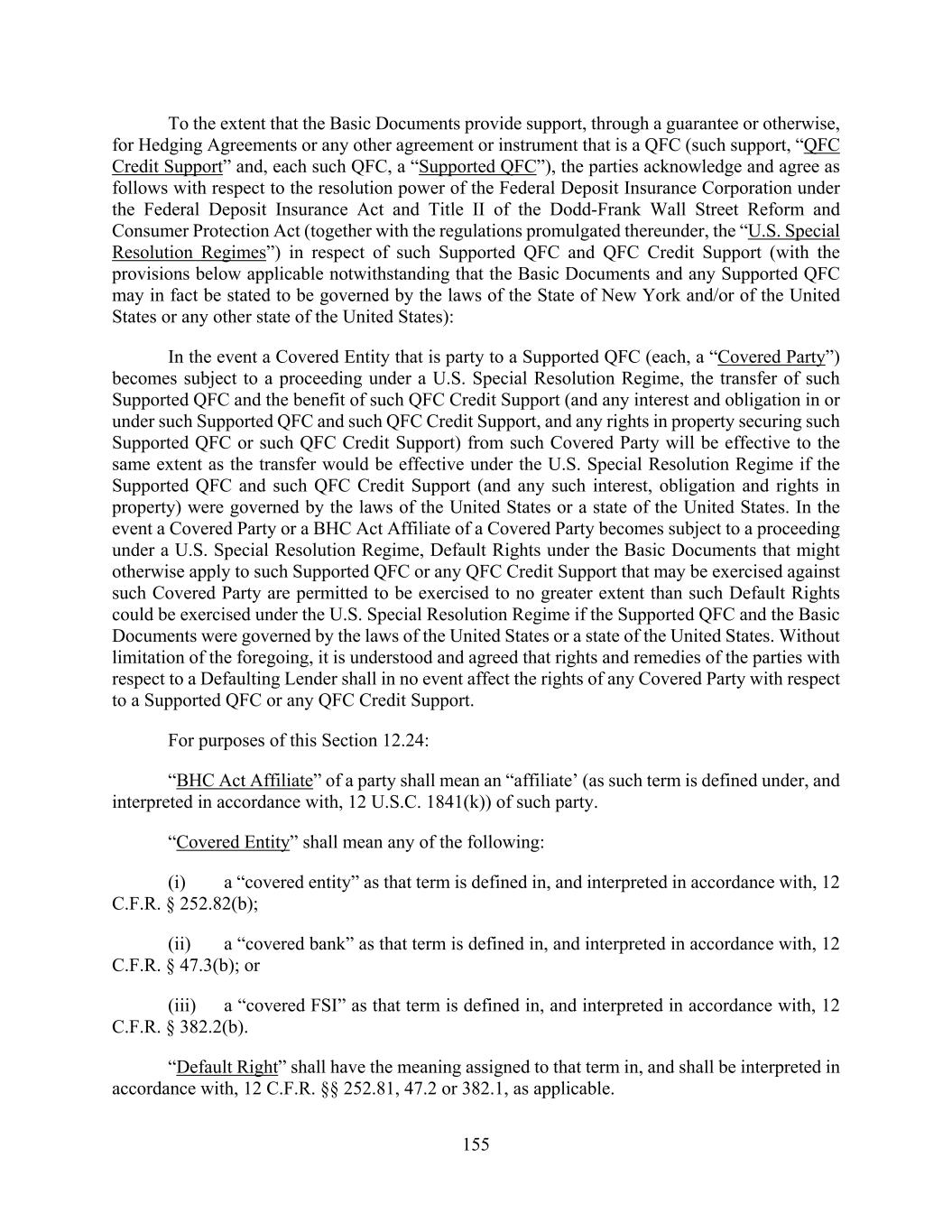 155 To the extent that the Basic Documents provide support, through a guarantee or otherwise, for Hedging Agreements or any other agreement or instrument that is a QFC (such support, “QFC Credit Support” and, each such QFC, a “Supported QFC”), the parties acknowledge and agree as follows with respect to the resolution power of the Federal Deposit Insurance Corporation under the Federal Deposit Insurance Act and Title II of the Dodd-Frank Wall Street Reform and Consumer Protection Act (together with the regulations promulgated thereunder, the “U.S. Special Resolution Regimes”) in respect of such Supported QFC and QFC Credit Support (with the provisions below applicable notwithstanding that the Basic Documents and any Supported QFC may in fact be stated to be governed by the laws of the State of New York and/or of the United States or any other state of the United States): In the event a Covered Entity that is party to a Supported QFC (each, a “Covered Party”) becomes subject to a proceeding under a U.S. Special Resolution Regime, the transfer of such Supported QFC and the benefit of such QFC Credit Support (and any interest and obligation in or under such Supported QFC and such QFC Credit Support, and any rights in property securing such Supported QFC or such QFC Credit Support) from such Covered Party will be effective to the same extent as the transfer would be effective under the U.S. Special Resolution Regime if the Supported QFC and such QFC Credit Support (and any such interest, obligation and rights in property) were governed by the laws of the United States or a state of the United States. In the event a Covered Party or a BHC Act Affiliate of a Covered Party becomes subject to a proceeding under a U.S. Special Resolution Regime, Default Rights under the Basic Documents that might otherwise apply to such Supported QFC or any QFC Credit Support that may be exercised against such Covered Party are permitted to be exercised to no greater extent than such Default Rights could be exercised under the U.S. Special Resolution Regime if the Supported QFC and the Basic Documents were governed by the laws of the United States or a state of the United States. Without limitation of the foregoing, it is understood and agreed that rights and remedies of the parties with respect to a Defaulting Lender shall in no event affect the rights of any Covered Party with respect to a Supported QFC or any QFC Credit Support. For purposes of this Section 12.24: “BHC Act Affiliate” of a party shall mean an “affiliate’ (as such term is defined under, and interpreted in accordance with, 12 U.S.C. 1841(k)) of such party. “Covered Entity” shall mean any of the following: (i) a “covered entity” as that term is defined in, and interpreted in accordance with, 12 C.F.R. § 252.82(b); (ii) a “covered bank” as that term is defined in, and interpreted in accordance with, 12 C.F.R. § 47.3(b); or (iii) a “covered FSI” as that term is defined in, and interpreted in accordance with, 12 C.F.R. § 382.2(b). “Default Right” shall have the meaning assigned to that term in, and shall be interpreted in accordance with, 12 C.F.R. §§ 252.81, 47.2 or 382.1, as applicable.