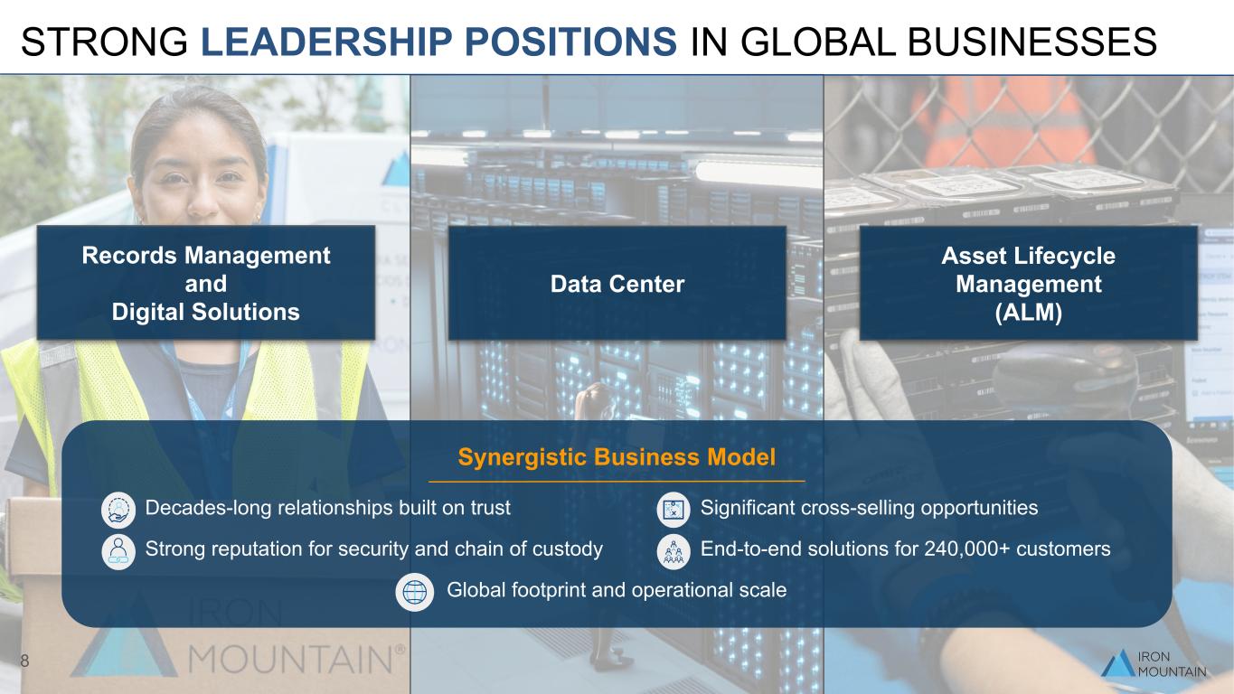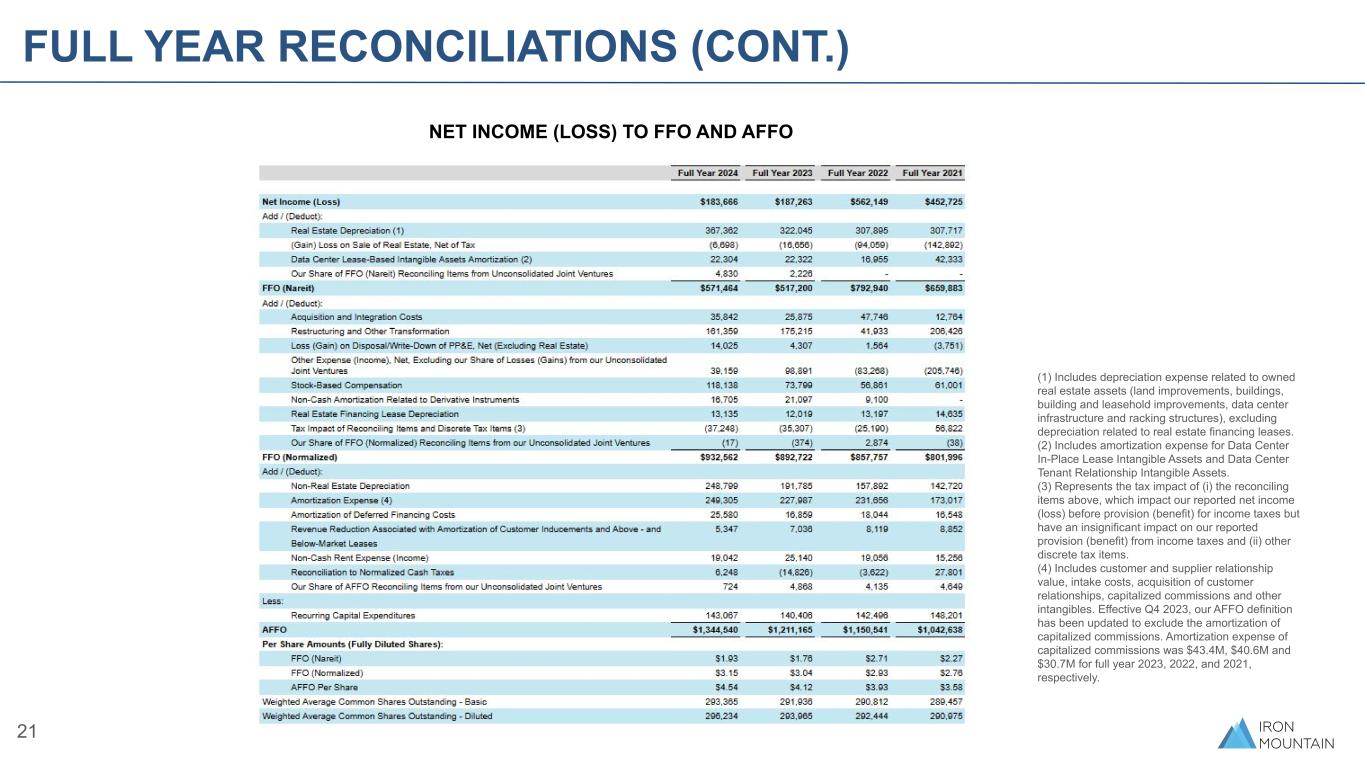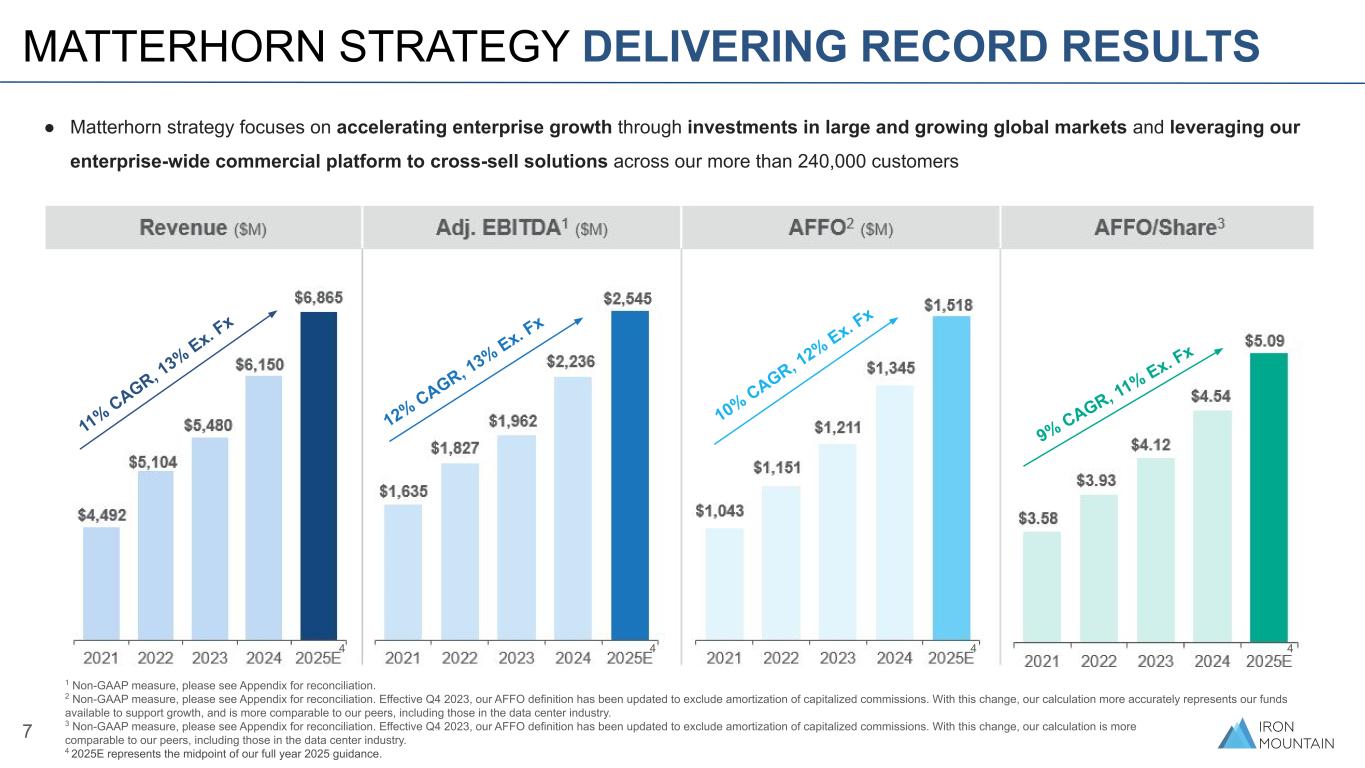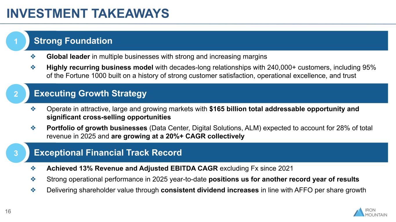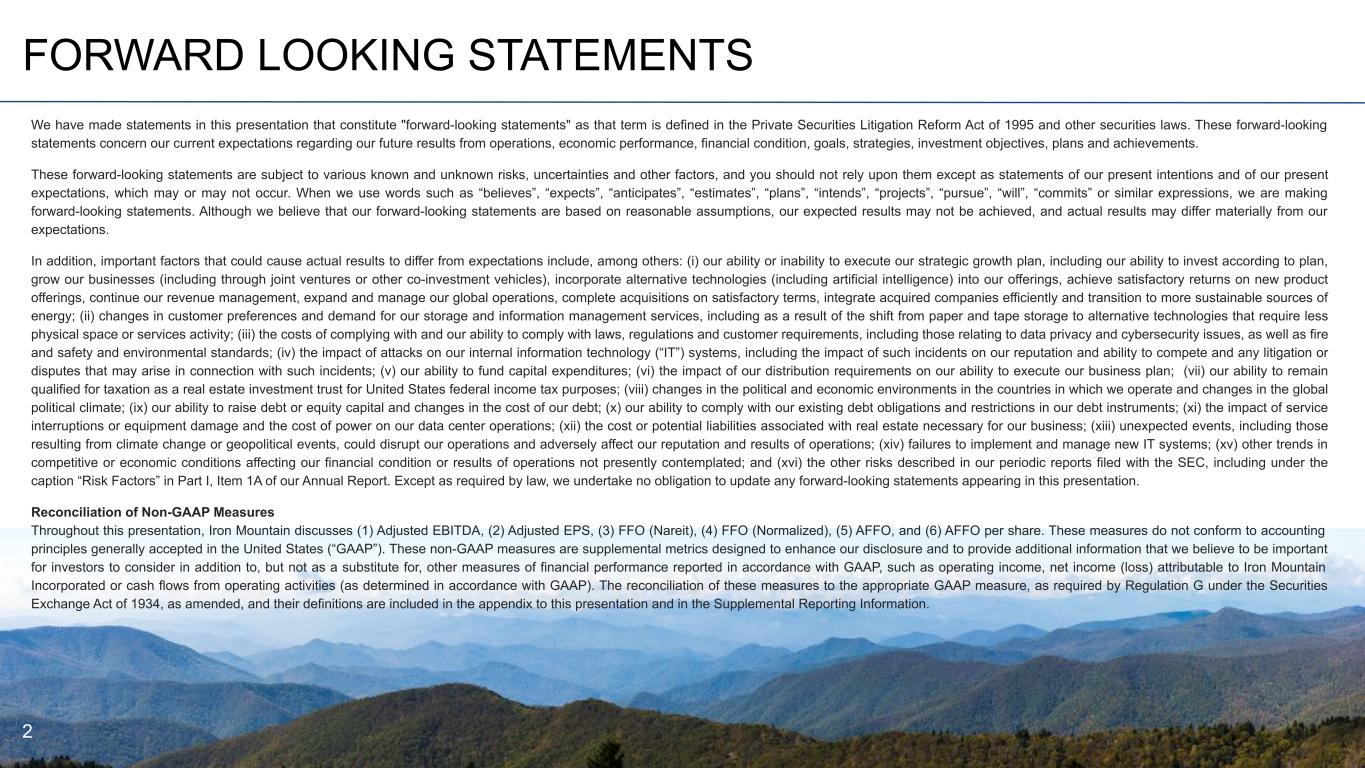 FORWARD LOOKING STATEMENTS We have made statements in this presentation that constitute "forward-looking statements" as that term is defined in the Private Securities Litigation Reform Act of 1995 and other securities laws. These forward-looking statements concern our current expectations regarding our future results from operations, economic performance, financial condition, goals, strategies, investment objectives, plans and achievements. These forward-looking statements are subject to various known and unknown risks, uncertainties and other factors, and you should not rely upon them except as statements of our present intentions and of our present expectations, which may or may not occur. When we use words such as “believes”, “expects”, “anticipates”, “estimates”, “plans”, “intends”, “projects”, “pursue”, “will”, “commits” or similar expressions, we are making forward-looking statements. Although we believe that our forward-looking statements are based on reasonable assumptions, our expected results may not be achieved, and actual results may differ materially from our expectations. In addition, important factors that could cause actual results to differ from expectations include, among others: (i) our ability or inability to execute our strategic growth plan, including our ability to invest according to plan, grow our businesses (including through joint ventures or other co-investment vehicles), incorporate alternative technologies (including artificial intelligence) into our offerings, achieve satisfactory returns on new product offerings, continue our revenue management, expand and manage our global operations, complete acquisitions on satisfactory terms, integrate acquired companies efficiently and transition to more sustainable sources of energy; (ii) changes in customer preferences and demand for our storage and information management services, including as a result of the shift from paper and tape storage to alternative technologies that require less physical space or services activity; (iii) the costs of complying with and our ability to comply with laws, regulations and customer requirements, including those relating to data privacy and cybersecurity issues, as well as fire and safety and environmental standards; (iv) the impact of attacks on our internal information technology (“IT”) systems, including the impact of such incidents on our reputation and ability to compete and any litigation or disputes that may arise in connection with such incidents; (v) our ability to fund capital expenditures; (vi) the impact of our distribution requirements on our ability to execute our business plan; (vii) our ability to remain qualified for taxation as a real estate investment trust for United States federal income tax purposes; (viii) changes in the political and economic environments in the countries in which we operate and changes in the global political climate; (ix) our ability to raise debt or equity capital and changes in the cost of our debt; (x) our ability to comply with our existing debt obligations and restrictions in our debt instruments; (xi) the impact of service interruptions or equipment damage and the cost of power on our data center operations; (xii) the cost or potential liabilities associated with real estate necessary for our business; (xiii) unexpected events, including those resulting from climate change or geopolitical events, could disrupt our operations and adversely affect our reputation and results of operations; (xiv) failures to implement and manage new IT systems; (xv) other trends in competitive or economic conditions affecting our financial condition or results of operations not presently contemplated; and (xvi) the other risks described in our periodic reports filed with the SEC, including under the caption “Risk Factors” in Part I, Item 1A of our Annual Report. Except as required by law, we undertake no obligation to update any forward-looking statements appearing in this presentation. Reconciliation of Non-GAAP Measures Throughout this presentation, Iron Mountain discusses (1) Adjusted EBITDA, (2) Adjusted EPS, (3) FFO (Nareit), (4) FFO (Normalized), (5) AFFO, and (6) AFFO per share. These measures do not conform to accounting principles generally accepted in the United States (“GAAP”). These non-GAAP measures are supplemental metrics designed to enhance our disclosure and to provide additional information that we believe to be important for investors to consider in addition to, but not as a substitute for, other measures of financial performance reported in accordance with GAAP, such as operating income, net income (loss) attributable to Iron Mountain Incorporated or cash flows from operating activities (as determined in accordance with GAAP). The reconciliation of these measures to the appropriate GAAP measure, as required by Regulation G under the Securities Exchange Act of 1934, as amended, and their definitions are included in the appendix to this presentation and in the Supplemental Reporting Information. 2