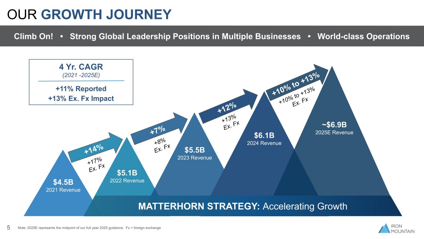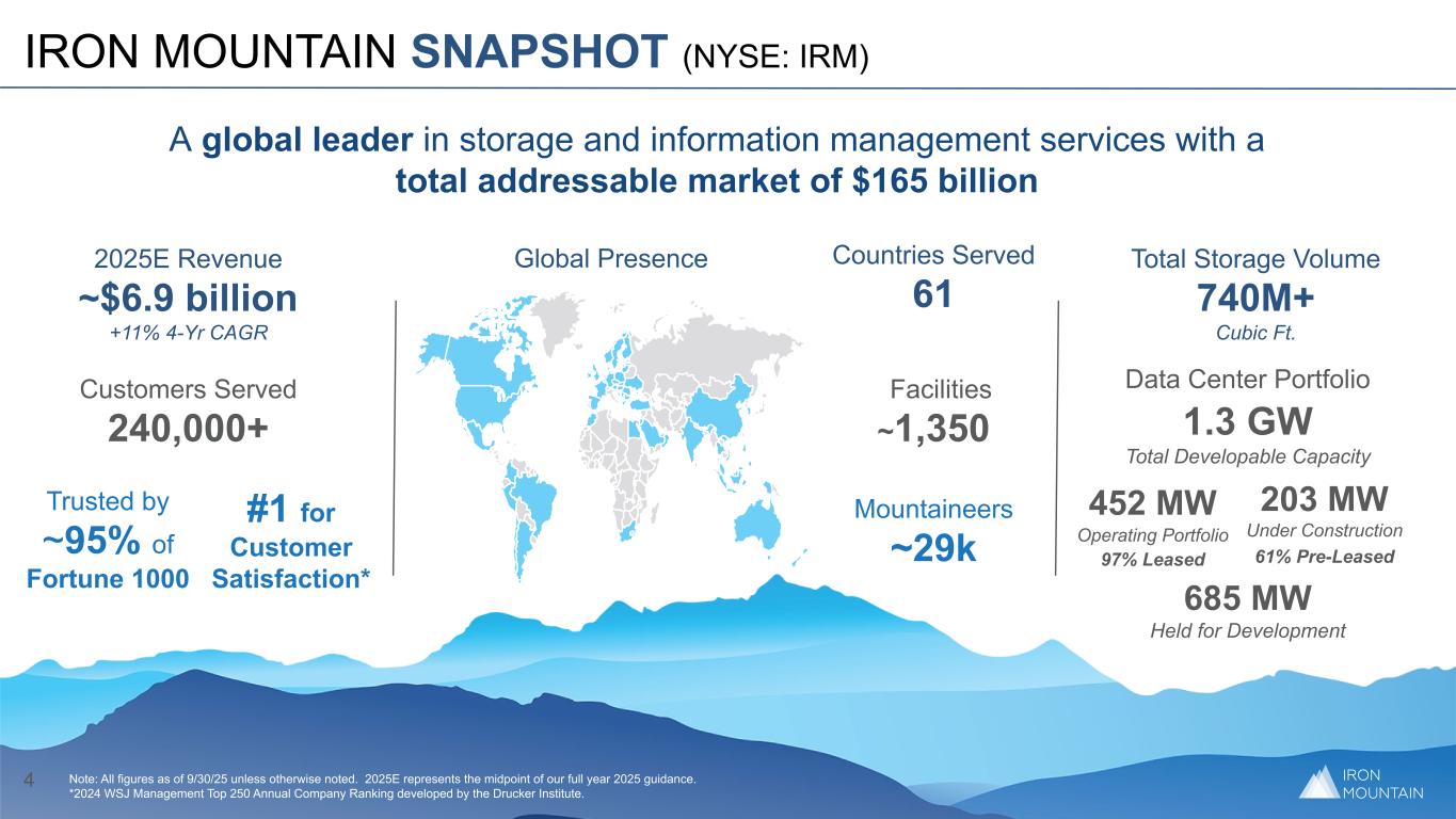 Global Presence Mountaineers ~29k Customers Served 240,000+ Trusted by ~95% of Fortune 1000 Facilities ~1,350 IRON MOUNTAIN SNAPSHOT (NYSE: IRM) A global leader in storage and information management services with a total addressable market of $165 billion 2025E Revenue ~$6.9 billion +11% 4-Yr CAGR Countries Served 61 Note: All figures as of 9/30/25 unless otherwise noted. 2025E represents the midpoint of our full year 2025 guidance. *2024 WSJ Management Top 250 Annual Company Ranking developed by the Drucker Institute. Total Storage Volume 740M+ Cubic Ft. 4 Data Center Portfolio 452 MW Operating Portfolio 97% Leased 203 MW Under Construction 61% Pre-Leased 685 MW Held for Development #1 for Customer Satisfaction* 1.3 GW Total Developable Capacity