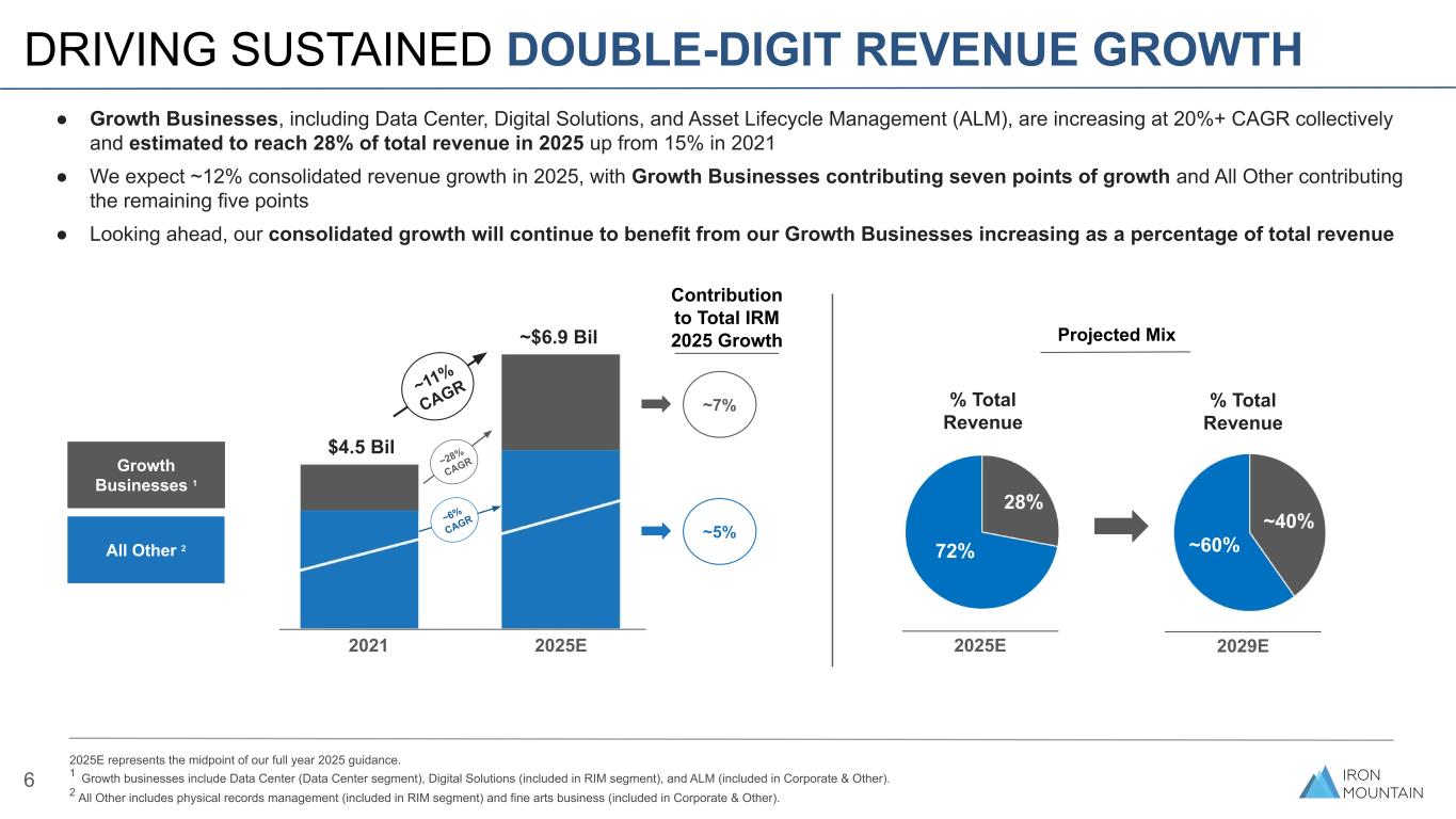 ● Growth Businesses, including Data Center, Digital Solutions, and Asset Lifecycle Management (ALM), are increasing at 20%+ CAGR collectively and estimated to reach 28% of total revenue in 2025 up from 15% in 2021 ● We expect ~12% consolidated revenue growth in 2025, with Growth Businesses contributing seven points of growth and All Other contributing the remaining five points ● Looking ahead, our consolidated growth will continue to benefit from our Growth Businesses increasing as a percentage of total revenue DRIVING SUSTAINED DOUBLE-DIGIT REVENUE GROWTH 2025E represents the midpoint of our full year 2025 guidance. 1 Growth businesses include Data Center (Data Center segment), Digital Solutions (included in RIM segment), and ALM (included in Corporate & Other). 2 All Other includes physical records management (included in RIM segment) and fine arts business (included in Corporate & Other). Growth Businesses 1 All Other 2 28% 2025E 72% 2025E2021 % Total Revenue $4.5 Bil ~$6.9 Bil ~11% CAGR Contribution to Total IRM 2025 Growth ~7% ~5% ~40% 2029E ~60% % Total Revenue ~6% CAGR ~28% CAGR 6 Projected Mix
