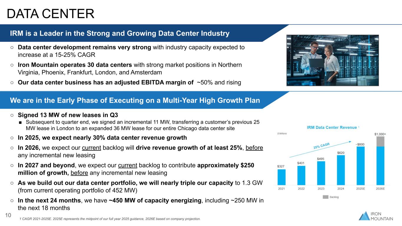 ○ Data center development remains very strong with industry capacity expected to increase at a 15-25% CAGR ○ Iron Mountain operates 30 data centers with strong market positions in Northern Virginia, Phoenix, Frankfurt, London, and Amsterdam ○ Our data center business has an adjusted EBITDA margin of ~50% and rising DATA CENTER 1 CAGR 2021-2025E. 2025E represents the midpoint of our full year 2025 guidance, 2026E based on company projection. ○ Signed 13 MW of new leases in Q3 ■ Subsequent to quarter end, we signed an incremental 11 MW, transferring a customer’s previous 25 MW lease in London to an expanded 36 MW lease for our entire Chicago data center site ○ In 2025, we expect nearly 30% data center revenue growth ○ In 2026, we expect our current backlog will drive revenue growth of at least 25%, before any incremental new leasing ○ In 2027 and beyond, we expect our current backlog to contribute approximately $250 million of growth, before any incremental new leasing ○ As we build out our data center portfolio, we will nearly triple our capacity to 1.3 GW (from current operating portfolio of 452 MW) ○ In the next 24 months, we have ~450 MW of capacity energizing, including ~250 MW in the next 18 months IRM is a Leader in the Strong and Growing Data Center Industry 10 We are in the Early Phase of Executing on a Multi-Year High Growth Plan 1