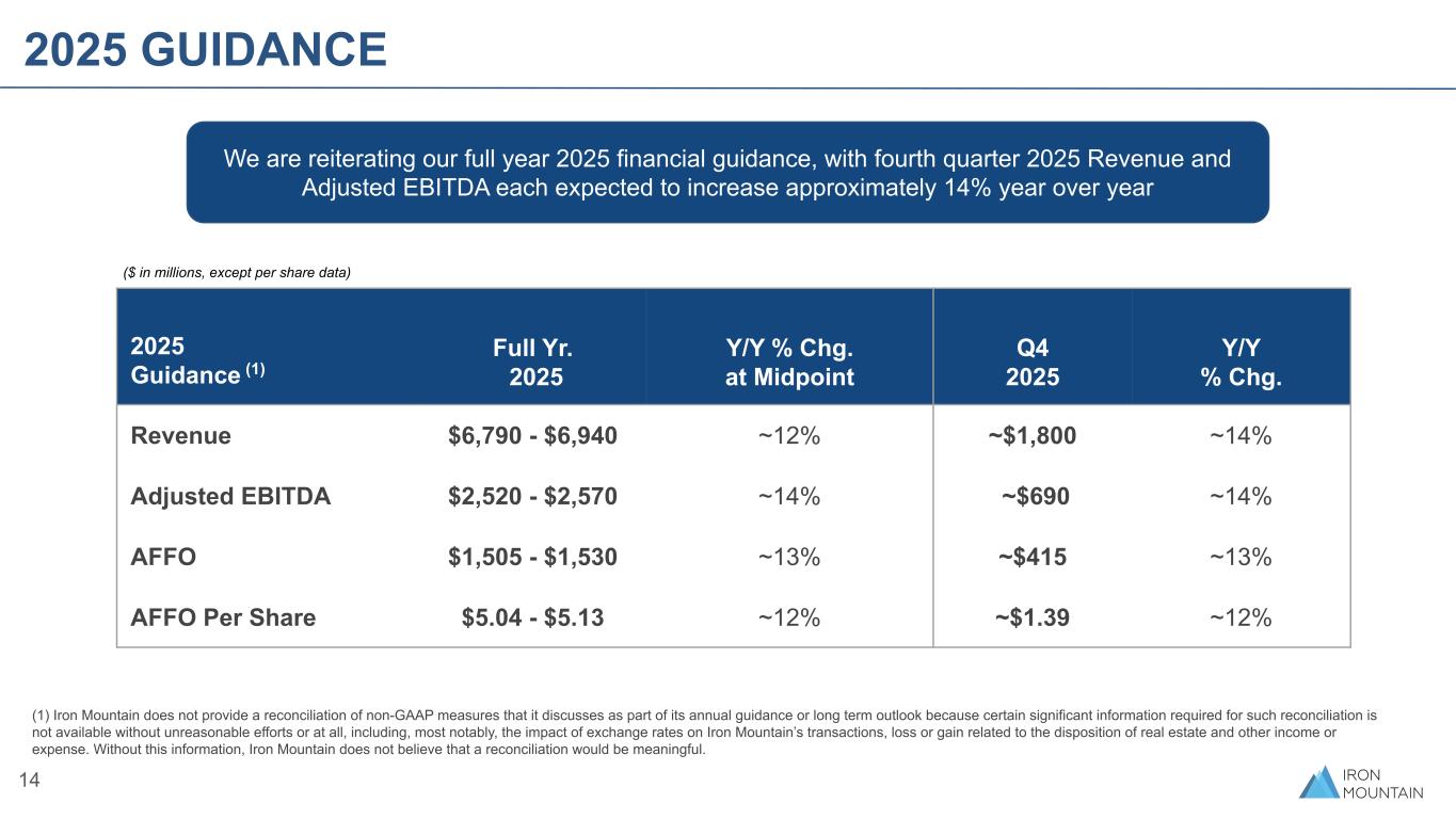 RECORD Q3 2025 RESULTS Three Months Ended YoY% Change 9/30/25 9/30/24 Reported $ Constant Fx $ in millions, except per share data Global RIM $1,339 $1,260 6% 5% Global Data Center $204 $153 33% 32% Corporate and Other $211 $144 47% 47% Total Revenues $1,754 $1,557 13% 12% Net Income (Loss) $86 ($34) n/a Reported EPS $0.28 ($0.11) n/a Adj. EPS $0.54 $0.44 23% Adj. EBITDA $660 $568 16% 16% Adj. EBITDA Margin 37.6% 36.5% 110 bps AFFO $393 $332 18% AFFO per share $1.32 $1.13 17% Key Highlights ● Record Q3 results with strength across business ○ Total Revenue +13% Y/Y ○ Adjusted EBITDA +16% Y/Y ○ AFFO +18% Y/Y ● Global RIM ○ Organic revenue growth +5% Y/Y ○ Continued strong revenue management ○ Improved records retention rate & higher utilization ● Data Center ○ Organic revenue growth +32% Y/Y ○ Strong Y/Y renewal pricing +14% (cash) and +19% (GAAP) ○ Low churn of 0.3% ● ALM ○ Organic revenue growth of 36% and reported growth +65% Y/Y ○ Solid expansion in profitability Y/Y ○ Acquired ACT Logistics in Q3, further strengthening our position in Australia ● Maintained strong balance sheet ○ Leverage* of 5.0x, within 4.5x to 5.5x target range ○ Enhanced liquidity via issuance of €1.2 billion 4.75% Senior Notes due 2034 ● Raising dividend by 10% effective January 2026 ○ This will mark the fourth consecutive year in which we have increased the dividend Adjusted EPS, Adjusted EBITDA and AFFO are non-GAAP measures; please see Appendix for reconciliation 13 *Long-term net lease adjusted leverage ratio