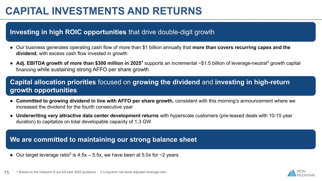 14 (1) Iron Mountain does not provide a reconciliation of non-GAAP measures that it discusses as part of its annual guidance or long term outlook because certain significant information required for such reconciliation is not available without unreasonable efforts or at all, including, most notably, the impact of exchange rates on Iron Mountain’s transactions, loss or gain related to the disposition of real estate and other income or expense. Without this information, Iron Mountain does not believe that a reconciliation would be meaningful. We are reiterating our full year 2025 financial guidance, with fourth quarter 2025 Revenue and Adjusted EBITDA each expected to increase approximately 14% year over year 2025 GUIDANCE 2025 Guidance (1) Full Yr. 2025 Y/Y % Chg. at Midpoint Q4 2025 Y/Y % Chg. Revenue $6,790 - $6,940 ~12% ~$1,800 ~14% Adjusted EBITDA $2,520 - $2,570 ~14% ~$690 ~14% AFFO $1,505 - $1,530 ~13% ~$415 ~13% AFFO Per Share $5.04 - $5.13 ~12% ~$1.39 ~12% ($ in millions, except per share data)