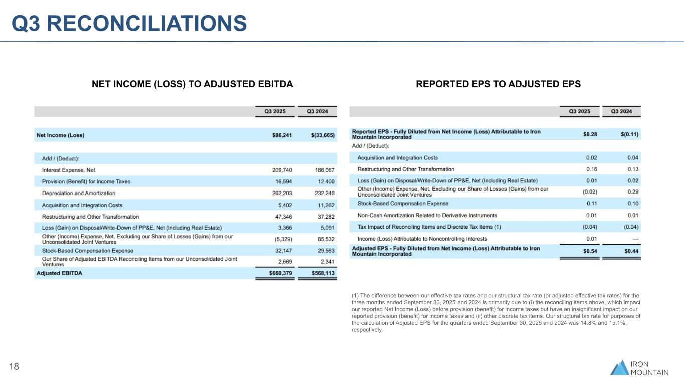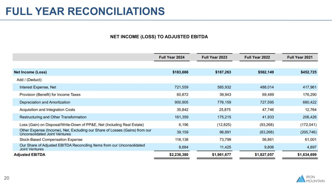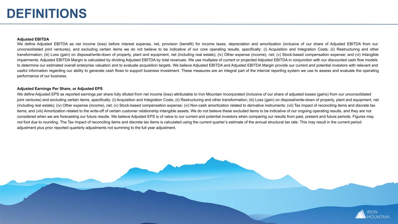 Adjusted EBITDA We define Adjusted EBITDA as net income (loss) before interest expense, net, provision (benefit) for income taxes, depreciation and amortization (inclusive of our share of Adjusted EBITDA from our unconsolidated joint ventures), and excluding certain items we do not believe to be indicative of our core operating results, specifically: (i) Acquisition and Integration Costs; (ii) Restructuring and other transformation; (iii) Loss (gain) on disposal/write-down of property, plant and equipment, net (including real estate); (iv) Other expense (income), net; (v) Stock-based compensation expense; and (vi) Intangible impairments. Adjusted EBITDA Margin is calculated by dividing Adjusted EBITDA by total revenues. We use multiples of current or projected Adjusted EBITDA in conjunction with our discounted cash flow models to determine our estimated overall enterprise valuation and to evaluate acquisition targets. We believe Adjusted EBITDA and Adjusted EBITDA Margin provide our current and potential investors with relevant and useful information regarding our ability to generate cash flows to support business investment. These measures are an integral part of the internal reporting system we use to assess and evaluate the operating performance of our business. Adjusted Earnings Per Share, or Adjusted EPS We define Adjusted EPS as reported earnings per share fully diluted from net income (loss) attributable to Iron Mountain Incorporated (inclusive of our share of adjusted losses (gains) from our unconsolidated joint ventures) and excluding certain items, specifically: (i) Acquisition and Integration Costs; (ii) Restructuring and other transformation; (iii) Loss (gain) on disposal/write-down of property, plant and equipment, net (including real estate); (iv) Other expense (income), net; (v) Stock-based compensation expense; (vi) Non-cash amortization related to derivative instruments; (vii) Tax impact of reconciling items and discrete tax items; and (viii) Amortization related to the write-off of certain customer relationship intangible assets. We do not believe these excluded items to be indicative of our ongoing operating results, and they are not considered when we are forecasting our future results. We believe Adjusted EPS is of value to our current and potential investors when comparing our results from past, present and future periods. Figures may not foot due to rounding. The Tax Impact of reconciling items and discrete tax items is calculated using the current quarter’s estimate of the annual structural tax rate. This may result in the current period adjustment plus prior reported quarterly adjustments not summing to the full year adjustment. DEFINITIONS