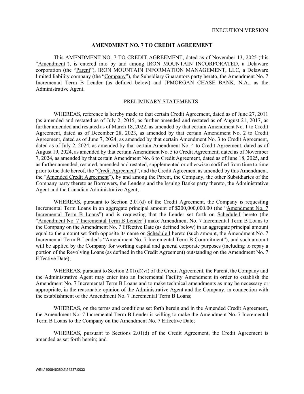 EXECUTION VERSION WEIL\100846380\6\54237.0033 AMENDMENT NO. 7 TO CREDIT AGREEMENT This AMENDMENT NO. 7 TO CREDIT AGREEMENT, dated as of November 13, 2025 (this “Amendment”), is entered into by and among IRON MOUNTAIN INCORPORATED, a Delaware corporation (the “Parent”), IRON MOUNTAIN INFORMATION MANAGEMENT, LLC, a Delaware limited liability company (the “Company”), the Subsidiary Guarantors party hereto, the Amendment No. 7 Incremental Term B Lender (as defined below) and JPMORGAN CHASE BANK, N.A., as the Administrative Agent. PRELIMINARY STATEMENTS WHEREAS, reference is hereby made to that certain Credit Agreement, dated as of June 27, 2011 (as amended and restated as of July 2, 2015, as further amended and restated as of August 21, 2017, as further amended and restated as of March 18, 2022, as amended by that certain Amendment No. 1 to Credit Agreement, dated as of December 28, 2023, as amended by that certain Amendment No. 2 to Credit Agreement, dated as of June 7, 2024, as amended by that certain Amendment No. 3 to Credit Agreement, dated as of July 2, 2024, as amended by that certain Amendment No. 4 to Credit Agreement, dated as of August 19, 2024, as amended by that certain Amendment No. 5 to Credit Agreement, dated as of November 7, 2024, as amended by that certain Amendment No. 6 to Credit Agreement, dated as of June 18, 2025, and as further amended, restated, amended and restated, supplemented or otherwise modified from time to time prior to the date hereof, the “Credit Agreement”, and the Credit Agreement as amended by this Amendment, the “Amended Credit Agreement”), by and among the Parent, the Company, the other Subsidiaries of the Company party thereto as Borrowers, the Lenders and the Issuing Banks party thereto, the Administrative Agent and the Canadian Administrative Agent; WHEREAS, pursuant to Section 2.01(d) of the Credit Agreement, the Company is requesting Incremental Term Loans in an aggregate principal amount of $200,000,000.00 (the “Amendment No. 7 Incremental Term B Loans”) and is requesting that the Lender set forth on Schedule I hereto (the “Amendment No. 7 Incremental Term B Lender”) make Amendment No. 7 Incremental Term B Loans to the Company on the Amendment No. 7 Effective Date (as defined below) in an aggregate principal amount equal to the amount set forth opposite its name on Schedule I hereto (such amount, the Amendment No. 7 Incremental Term B Lender’s “Amendment No. 7 Incremental Term B Commitment”), and such amount will be applied by the Company for working capital and general corporate purposes (including to repay a portion of the Revolving Loans (as defined in the Credit Agreement) outstanding on the Amendment No. 7 Effective Date); WHEREAS, pursuant to Section 2.01(d)(vi) of the Credit Agreement, the Parent, the Company and the Administrative Agent may enter into an Incremental Facility Amendment in order to establish the Amendment No. 7 Incremental Term B Loans and to make technical amendments as may be necessary or appropriate, in the reasonable opinion of the Administrative Agent and the Company, in connection with the establishment of the Amendment No. 7 Incremental Term B Loans; WHEREAS, on the terms and conditions set forth herein and in the Amended Credit Agreement, the Amendment No. 7 Incremental Term B Lender is willing to make the Amendment No. 7 Incremental Term B Loans to the Company on the Amendment No. 7 Effective Date; WHEREAS, pursuant to Sections 2.01(d) of the Credit Agreement, the Credit Agreement is amended as set forth herein; and