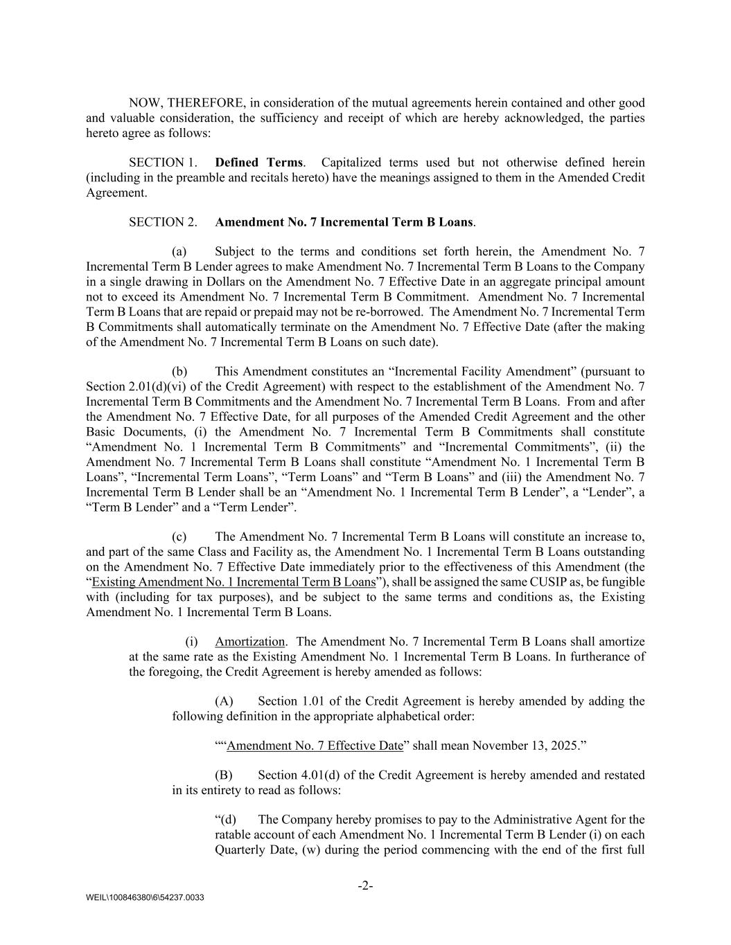 -2- WEIL\100846380\6\54237.0033 NOW, THEREFORE, in consideration of the mutual agreements herein contained and other good and valuable consideration, the sufficiency and receipt of which are hereby acknowledged, the parties hereto agree as follows: SECTION 1. Defined Terms. Capitalized terms used but not otherwise defined herein (including in the preamble and recitals hereto) have the meanings assigned to them in the Amended Credit Agreement. SECTION 2. Amendment No. 7 Incremental Term B Loans. (a) Subject to the terms and conditions set forth herein, the Amendment No. 7 Incremental Term B Lender agrees to make Amendment No. 7 Incremental Term B Loans to the Company in a single drawing in Dollars on the Amendment No. 7 Effective Date in an aggregate principal amount not to exceed its Amendment No. 7 Incremental Term B Commitment. Amendment No. 7 Incremental Term B Loans that are repaid or prepaid may not be re-borrowed. The Amendment No. 7 Incremental Term B Commitments shall automatically terminate on the Amendment No. 7 Effective Date (after the making of the Amendment No. 7 Incremental Term B Loans on such date). (b) This Amendment constitutes an “Incremental Facility Amendment” (pursuant to Section 2.01(d)(vi) of the Credit Agreement) with respect to the establishment of the Amendment No. 7 Incremental Term B Commitments and the Amendment No. 7 Incremental Term B Loans. From and after the Amendment No. 7 Effective Date, for all purposes of the Amended Credit Agreement and the other Basic Documents, (i) the Amendment No. 7 Incremental Term B Commitments shall constitute “Amendment No. 1 Incremental Term B Commitments” and “Incremental Commitments”, (ii) the Amendment No. 7 Incremental Term B Loans shall constitute “Amendment No. 1 Incremental Term B Loans”, “Incremental Term Loans”, “Term Loans” and “Term B Loans” and (iii) the Amendment No. 7 Incremental Term B Lender shall be an “Amendment No. 1 Incremental Term B Lender”, a “Lender”, a “Term B Lender” and a “Term Lender”. (c) The Amendment No. 7 Incremental Term B Loans will constitute an increase to, and part of the same Class and Facility as, the Amendment No. 1 Incremental Term B Loans outstanding on the Amendment No. 7 Effective Date immediately prior to the effectiveness of this Amendment (the “Existing Amendment No. 1 Incremental Term B Loans”), shall be assigned the same CUSIP as, be fungible with (including for tax purposes), and be subject to the same terms and conditions as, the Existing Amendment No. 1 Incremental Term B Loans. (i) Amortization. The Amendment No. 7 Incremental Term B Loans shall amortize at the same rate as the Existing Amendment No. 1 Incremental Term B Loans. In furtherance of the foregoing, the Credit Agreement is hereby amended as follows: (A) Section 1.01 of the Credit Agreement is hereby amended by adding the following definition in the appropriate alphabetical order: ““Amendment No. 7 Effective Date” shall mean November 13, 2025.” (B) Section 4.01(d) of the Credit Agreement is hereby amended and restated in its entirety to read as follows: “(d) The Company hereby promises to pay to the Administrative Agent for the ratable account of each Amendment No. 1 Incremental Term B Lender (i) on each Quarterly Date, (w) during the period commencing with the end of the first full