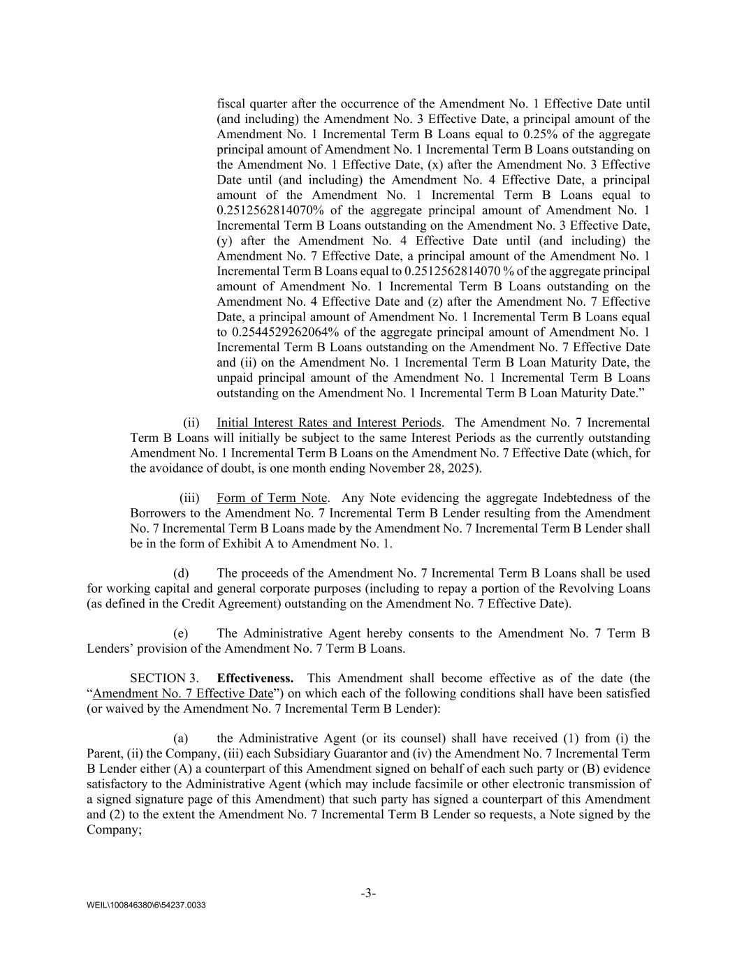 -3- WEIL\100846380\6\54237.0033 fiscal quarter after the occurrence of the Amendment No. 1 Effective Date until (and including) the Amendment No. 3 Effective Date, a principal amount of the Amendment No. 1 Incremental Term B Loans equal to 0.25% of the aggregate principal amount of Amendment No. 1 Incremental Term B Loans outstanding on the Amendment No. 1 Effective Date, (x) after the Amendment No. 3 Effective Date until (and including) the Amendment No. 4 Effective Date, a principal amount of the Amendment No. 1 Incremental Term B Loans equal to 0.2512562814070% of the aggregate principal amount of Amendment No. 1 Incremental Term B Loans outstanding on the Amendment No. 3 Effective Date, (y) after the Amendment No. 4 Effective Date until (and including) the Amendment No. 7 Effective Date, a principal amount of the Amendment No. 1 Incremental Term B Loans equal to 0.2512562814070 % of the aggregate principal amount of Amendment No. 1 Incremental Term B Loans outstanding on the Amendment No. 4 Effective Date and (z) after the Amendment No. 7 Effective Date, a principal amount of Amendment No. 1 Incremental Term B Loans equal to 0.2544529262064% of the aggregate principal amount of Amendment No. 1 Incremental Term B Loans outstanding on the Amendment No. 7 Effective Date and (ii) on the Amendment No. 1 Incremental Term B Loan Maturity Date, the unpaid principal amount of the Amendment No. 1 Incremental Term B Loans outstanding on the Amendment No. 1 Incremental Term B Loan Maturity Date.” (ii) Initial Interest Rates and Interest Periods. The Amendment No. 7 Incremental Term B Loans will initially be subject to the same Interest Periods as the currently outstanding Amendment No. 1 Incremental Term B Loans on the Amendment No. 7 Effective Date (which, for the avoidance of doubt, is one month ending November 28, 2025). (iii) Form of Term Note. Any Note evidencing the aggregate Indebtedness of the Borrowers to the Amendment No. 7 Incremental Term B Lender resulting from the Amendment No. 7 Incremental Term B Loans made by the Amendment No. 7 Incremental Term B Lender shall be in the form of Exhibit A to Amendment No. 1. (d) The proceeds of the Amendment No. 7 Incremental Term B Loans shall be used for working capital and general corporate purposes (including to repay a portion of the Revolving Loans (as defined in the Credit Agreement) outstanding on the Amendment No. 7 Effective Date). (e) The Administrative Agent hereby consents to the Amendment No. 7 Term B Lenders’ provision of the Amendment No. 7 Term B Loans. SECTION 3. Effectiveness. This Amendment shall become effective as of the date (the “Amendment No. 7 Effective Date”) on which each of the following conditions shall have been satisfied (or waived by the Amendment No. 7 Incremental Term B Lender): (a) the Administrative Agent (or its counsel) shall have received (1) from (i) the Parent, (ii) the Company, (iii) each Subsidiary Guarantor and (iv) the Amendment No. 7 Incremental Term B Lender either (A) a counterpart of this Amendment signed on behalf of each such party or (B) evidence satisfactory to the Administrative Agent (which may include facsimile or other electronic transmission of a signed signature page of this Amendment) that such party has signed a counterpart of this Amendment and (2) to the extent the Amendment No. 7 Incremental Term B Lender so requests, a Note signed by the Company;