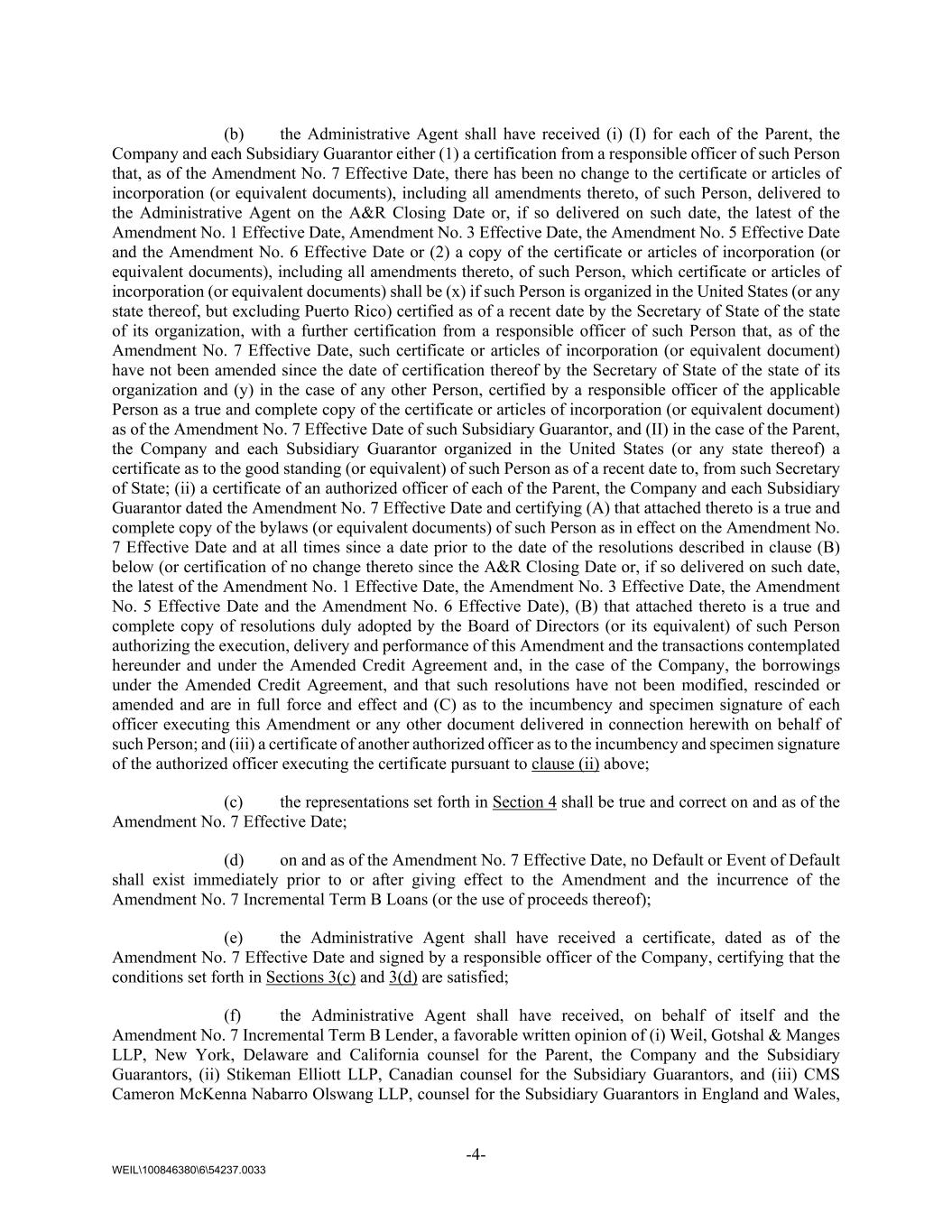 -4- WEIL\100846380\6\54237.0033 (b) the Administrative Agent shall have received (i) (I) for each of the Parent, the Company and each Subsidiary Guarantor either (1) a certification from a responsible officer of such Person that, as of the Amendment No. 7 Effective Date, there has been no change to the certificate or articles of incorporation (or equivalent documents), including all amendments thereto, of such Person, delivered to the Administrative Agent on the A&R Closing Date or, if so delivered on such date, the latest of the Amendment No. 1 Effective Date, Amendment No. 3 Effective Date, the Amendment No. 5 Effective Date and the Amendment No. 6 Effective Date or (2) a copy of the certificate or articles of incorporation (or equivalent documents), including all amendments thereto, of such Person, which certificate or articles of incorporation (or equivalent documents) shall be (x) if such Person is organized in the United States (or any state thereof, but excluding Puerto Rico) certified as of a recent date by the Secretary of State of the state of its organization, with a further certification from a responsible officer of such Person that, as of the Amendment No. 7 Effective Date, such certificate or articles of incorporation (or equivalent document) have not been amended since the date of certification thereof by the Secretary of State of the state of its organization and (y) in the case of any other Person, certified by a responsible officer of the applicable Person as a true and complete copy of the certificate or articles of incorporation (or equivalent document) as of the Amendment No. 7 Effective Date of such Subsidiary Guarantor, and (II) in the case of the Parent, the Company and each Subsidiary Guarantor organized in the United States (or any state thereof) a certificate as to the good standing (or equivalent) of such Person as of a recent date to, from such Secretary of State; (ii) a certificate of an authorized officer of each of the Parent, the Company and each Subsidiary Guarantor dated the Amendment No. 7 Effective Date and certifying (A) that attached thereto is a true and complete copy of the bylaws (or equivalent documents) of such Person as in effect on the Amendment No. 7 Effective Date and at all times since a date prior to the date of the resolutions described in clause (B) below (or certification of no change thereto since the A&R Closing Date or, if so delivered on such date, the latest of the Amendment No. 1 Effective Date, the Amendment No. 3 Effective Date, the Amendment No. 5 Effective Date and the Amendment No. 6 Effective Date), (B) that attached thereto is a true and complete copy of resolutions duly adopted by the Board of Directors (or its equivalent) of such Person authorizing the execution, delivery and performance of this Amendment and the transactions contemplated hereunder and under the Amended Credit Agreement and, in the case of the Company, the borrowings under the Amended Credit Agreement, and that such resolutions have not been modified, rescinded or amended and are in full force and effect and (C) as to the incumbency and specimen signature of each officer executing this Amendment or any other document delivered in connection herewith on behalf of such Person; and (iii) a certificate of another authorized officer as to the incumbency and specimen signature of the authorized officer executing the certificate pursuant to clause (ii) above; (c) the representations set forth in Section 4 shall be true and correct on and as of the Amendment No. 7 Effective Date; (d) on and as of the Amendment No. 7 Effective Date, no Default or Event of Default shall exist immediately prior to or after giving effect to the Amendment and the incurrence of the Amendment No. 7 Incremental Term B Loans (or the use of proceeds thereof); (e) the Administrative Agent shall have received a certificate, dated as of the Amendment No. 7 Effective Date and signed by a responsible officer of the Company, certifying that the conditions set forth in Sections 3(c) and 3(d) are satisfied; (f) the Administrative Agent shall have received, on behalf of itself and the Amendment No. 7 Incremental Term B Lender, a favorable written opinion of (i) Weil, Gotshal & Manges LLP, New York, Delaware and California counsel for the Parent, the Company and the Subsidiary Guarantors, (ii) Stikeman Elliott LLP, Canadian counsel for the Subsidiary Guarantors, and (iii) CMS Cameron McKenna Nabarro Olswang LLP, counsel for the Subsidiary Guarantors in England and Wales,