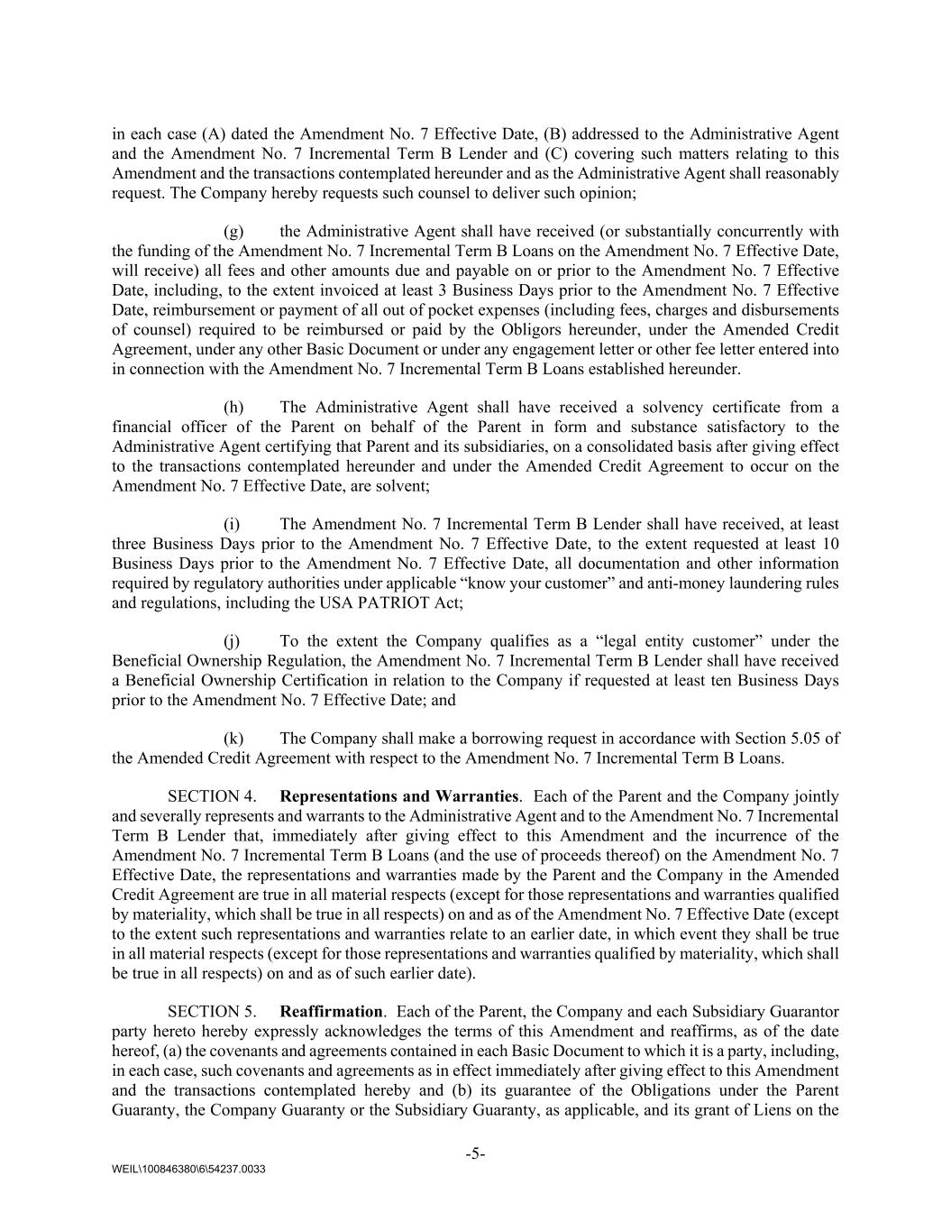 -5- WEIL\100846380\6\54237.0033 in each case (A) dated the Amendment No. 7 Effective Date, (B) addressed to the Administrative Agent and the Amendment No. 7 Incremental Term B Lender and (C) covering such matters relating to this Amendment and the transactions contemplated hereunder and as the Administrative Agent shall reasonably request. The Company hereby requests such counsel to deliver such opinion; (g) the Administrative Agent shall have received (or substantially concurrently with the funding of the Amendment No. 7 Incremental Term B Loans on the Amendment No. 7 Effective Date, will receive) all fees and other amounts due and payable on or prior to the Amendment No. 7 Effective Date, including, to the extent invoiced at least 3 Business Days prior to the Amendment No. 7 Effective Date, reimbursement or payment of all out of pocket expenses (including fees, charges and disbursements of counsel) required to be reimbursed or paid by the Obligors hereunder, under the Amended Credit Agreement, under any other Basic Document or under any engagement letter or other fee letter entered into in connection with the Amendment No. 7 Incremental Term B Loans established hereunder. (h) The Administrative Agent shall have received a solvency certificate from a financial officer of the Parent on behalf of the Parent in form and substance satisfactory to the Administrative Agent certifying that Parent and its subsidiaries, on a consolidated basis after giving effect to the transactions contemplated hereunder and under the Amended Credit Agreement to occur on the Amendment No. 7 Effective Date, are solvent; (i) The Amendment No. 7 Incremental Term B Lender shall have received, at least three Business Days prior to the Amendment No. 7 Effective Date, to the extent requested at least 10 Business Days prior to the Amendment No. 7 Effective Date, all documentation and other information required by regulatory authorities under applicable “know your customer” and anti-money laundering rules and regulations, including the USA PATRIOT Act; (j) To the extent the Company qualifies as a “legal entity customer” under the Beneficial Ownership Regulation, the Amendment No. 7 Incremental Term B Lender shall have received a Beneficial Ownership Certification in relation to the Company if requested at least ten Business Days prior to the Amendment No. 7 Effective Date; and (k) The Company shall make a borrowing request in accordance with Section 5.05 of the Amended Credit Agreement with respect to the Amendment No. 7 Incremental Term B Loans. SECTION 4. Representations and Warranties. Each of the Parent and the Company jointly and severally represents and warrants to the Administrative Agent and to the Amendment No. 7 Incremental Term B Lender that, immediately after giving effect to this Amendment and the incurrence of the Amendment No. 7 Incremental Term B Loans (and the use of proceeds thereof) on the Amendment No. 7 Effective Date, the representations and warranties made by the Parent and the Company in the Amended Credit Agreement are true in all material respects (except for those representations and warranties qualified by materiality, which shall be true in all respects) on and as of the Amendment No. 7 Effective Date (except to the extent such representations and warranties relate to an earlier date, in which event they shall be true in all material respects (except for those representations and warranties qualified by materiality, which shall be true in all respects) on and as of such earlier date). SECTION 5. Reaffirmation. Each of the Parent, the Company and each Subsidiary Guarantor party hereto hereby expressly acknowledges the terms of this Amendment and reaffirms, as of the date hereof, (a) the covenants and agreements contained in each Basic Document to which it is a party, including, in each case, such covenants and agreements as in effect immediately after giving effect to this Amendment and the transactions contemplated hereby and (b) its guarantee of the Obligations under the Parent Guaranty, the Company Guaranty or the Subsidiary Guaranty, as applicable, and its grant of Liens on the