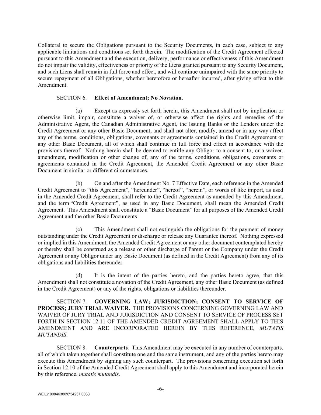 -6- WEIL\100846380\6\54237.0033 Collateral to secure the Obligations pursuant to the Security Documents, in each case, subject to any applicable limitations and conditions set forth therein. The modification of the Credit Agreement effected pursuant to this Amendment and the execution, delivery, performance or effectiveness of this Amendment do not impair the validity, effectiveness or priority of the Liens granted pursuant to any Security Document, and such Liens shall remain in full force and effect, and will continue unimpaired with the same priority to secure repayment of all Obligations, whether heretofore or hereafter incurred, after giving effect to this Amendment. SECTION 6. Effect of Amendment; No Novation. (a) Except as expressly set forth herein, this Amendment shall not by implication or otherwise limit, impair, constitute a waiver of, or otherwise affect the rights and remedies of the Administrative Agent, the Canadian Administrative Agent, the Issuing Banks or the Lenders under the Credit Agreement or any other Basic Document, and shall not alter, modify, amend or in any way affect any of the terms, conditions, obligations, covenants or agreements contained in the Credit Agreement or any other Basic Document, all of which shall continue in full force and effect in accordance with the provisions thereof. Nothing herein shall be deemed to entitle any Obligor to a consent to, or a waiver, amendment, modification or other change of, any of the terms, conditions, obligations, covenants or agreements contained in the Credit Agreement, the Amended Credit Agreement or any other Basic Document in similar or different circumstances. (b) On and after the Amendment No. 7 Effective Date, each reference in the Amended Credit Agreement to “this Agreement”, “hereunder”, “hereof”, “herein”, or words of like import, as used in the Amended Credit Agreement, shall refer to the Credit Agreement as amended by this Amendment, and the term “Credit Agreement”, as used in any Basic Document, shall mean the Amended Credit Agreement. This Amendment shall constitute a “Basic Document” for all purposes of the Amended Credit Agreement and the other Basic Documents. (c) This Amendment shall not extinguish the obligations for the payment of money outstanding under the Credit Agreement or discharge or release any Guarantee thereof. Nothing expressed or implied in this Amendment, the Amended Credit Agreement or any other document contemplated hereby or thereby shall be construed as a release or other discharge of Parent or the Company under the Credit Agreement or any Obligor under any Basic Document (as defined in the Credit Agreement) from any of its obligations and liabilities thereunder. (d) It is the intent of the parties hereto, and the parties hereto agree, that this Amendment shall not constitute a novation of the Credit Agreement, any other Basic Document (as defined in the Credit Agreement) or any of the rights, obligations or liabilities thereunder. SECTION 7. GOVERNING LAW; JURISDICTION; CONSENT TO SERVICE OF PROCESS; JURY TRIAL WAIVER. THE PROVISIONS CONCERNING GOVERNING LAW AND WAIVER OF JURY TRIAL AND JURISDICTION AND CONSENT TO SERVICE OF PROCESS SET FORTH IN SECTION 12.11 OF THE AMENDED CREDIT AGREEMENT SHALL APPLY TO THIS AMENDMENT AND ARE INCORPORATED HEREIN BY THIS REFERENCE, MUTATIS MUTANDIS. SECTION 8. Counterparts. This Amendment may be executed in any number of counterparts, all of which taken together shall constitute one and the same instrument, and any of the parties hereto may execute this Amendment by signing any such counterpart. The provisions concerning execution set forth in Section 12.10 of the Amended Credit Agreement shall apply to this Amendment and incorporated herein by this reference, mutatis mutandis.