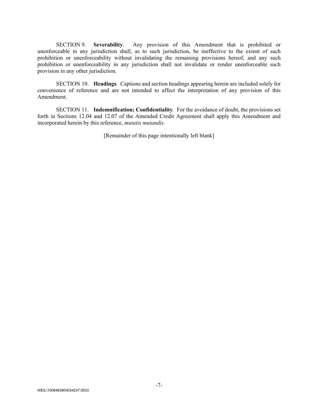 -7- WEIL\100846380\6\54237.0033 SECTION 9. Severability. Any provision of this Amendment that is prohibited or unenforceable in any jurisdiction shall, as to such jurisdiction, be ineffective to the extent of such prohibition or unenforceability without invalidating the remaining provisions hereof, and any such prohibition or unenforceability in any jurisdiction shall not invalidate or render unenforceable such provision in any other jurisdiction. SECTION 10. Headings. Captions and section headings appearing herein are included solely for convenience of reference and are not intended to affect the interpretation of any provision of this Amendment. SECTION 11. Indemnification; Confidentiality. For the avoidance of doubt, the provisions set forth in Sections 12.04 and 12.07 of the Amended Credit Agreement shall apply this Amendment and incorporated herein by this reference, mutatis mutandis. [Remainder of this page intentionally left blank]