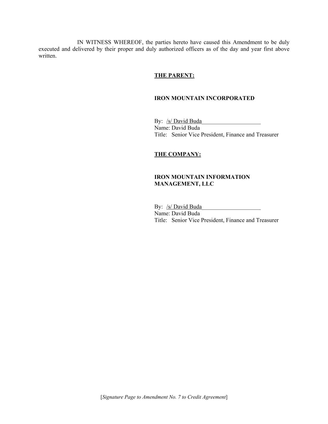 [Signature Page to Amendment No. 7 to Credit Agreement] IN WITNESS WHEREOF, the parties hereto have caused this Amendment to be duly executed and delivered by their proper and duly authorized officers as of the day and year first above written. THE PARENT: IRON MOUNTAIN INCORPORATED By: /s/ David Buda____________________ Name: David Buda Title: Senior Vice President, Finance and Treasurer THE COMPANY: IRON MOUNTAIN INFORMATION MANAGEMENT, LLC By: /s/ David Buda____________________ Name: David Buda Title: Senior Vice President, Finance and Treasurer