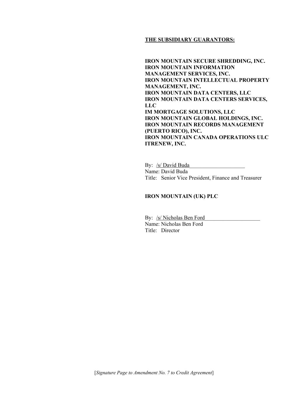[Signature Page to Amendment No. 7 to Credit Agreement] THE SUBSIDIARY GUARANTORS: IRON MOUNTAIN SECURE SHREDDING, INC. IRON MOUNTAIN INFORMATION MANAGEMENT SERVICES, INC. IRON MOUNTAIN INTELLECTUAL PROPERTY MANAGEMENT, INC. IRON MOUNTAIN DATA CENTERS, LLC IRON MOUNTAIN DATA CENTERS SERVICES, LLC IM MORTGAGE SOLUTIONS, LLC IRON MOUNTAIN GLOBAL HOLDINGS, INC. IRON MOUNTAIN RECORDS MANAGEMENT (PUERTO RICO), INC. IRON MOUNTAIN CANADA OPERATIONS ULC ITRENEW, INC. By: /s/ David Buda____________________ Name: David Buda Title: Senior Vice President, Finance and Treasurer IRON MOUNTAIN (UK) PLC By: /s/ Nicholas Ben Ford____________________ Name: Nicholas Ben Ford Title: Director