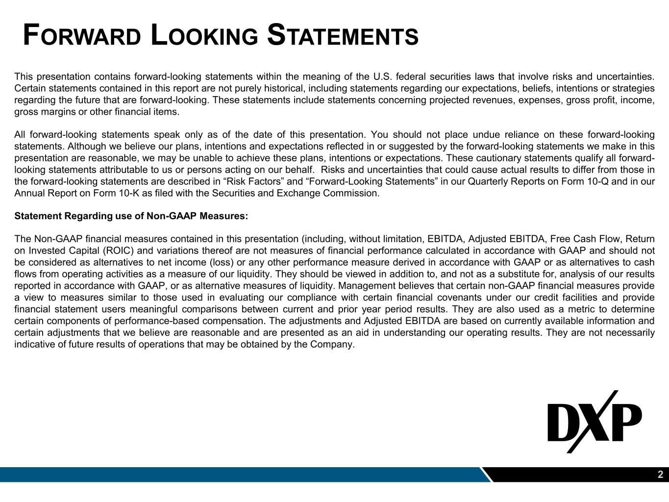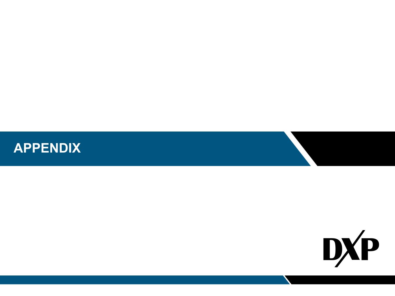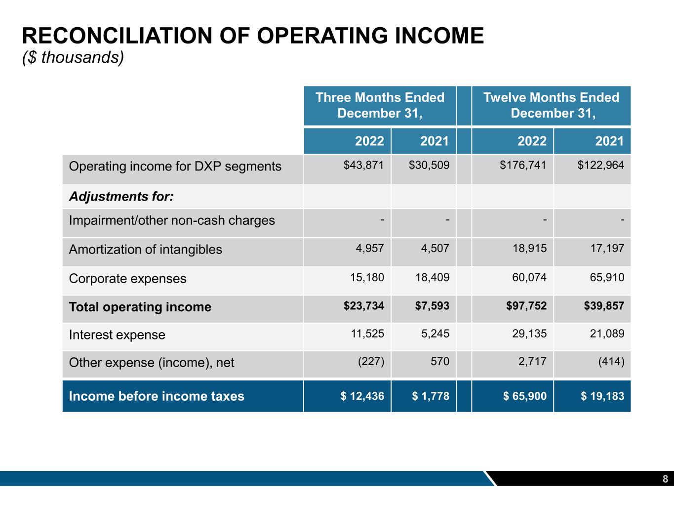 RECONCILIATION OF OPERATING INCOME ($ thousands) Three Months Ended December 31, Twelve Months Ended December 31, 2022 2021 2022 2021 Operating income for DXP segments $43,871 $30,509 $176,741 $122,964 Adjustments for: Impairment/other non-cash charges - - - - Amortization of intangibles 4,957 4,507 18,915 17,197 Corporate expenses 15,180 18,409 60,074 65,910 Total operating income $23,734 $7,593 $97,752 $39,857 Interest expense 11,525 5,245 29,135 21,089 Other expense (income), net (227) 570 2,717 (414) Income before income taxes $ 12,436 $ 1,778 $ 65,900 $ 19,183 8