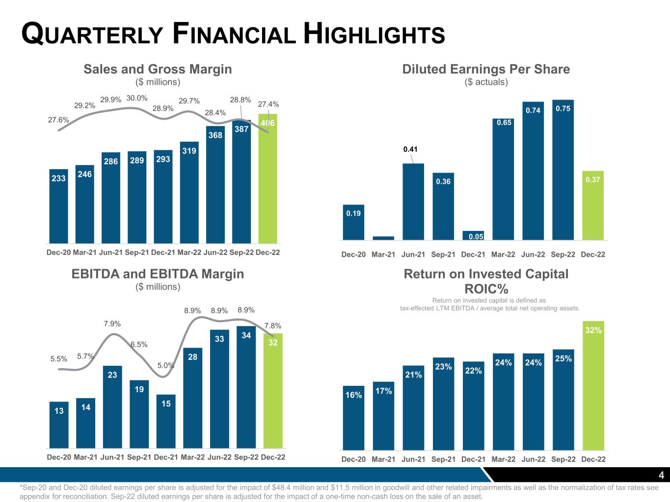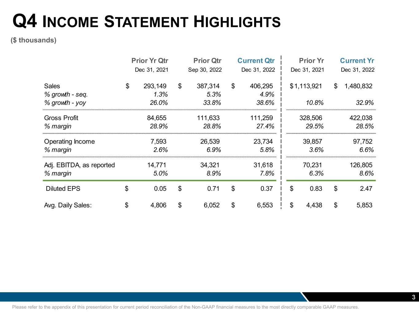 Please refer to the appendix of this presentation for current period reconciliation of the Non-GAAP financial measures to the most directly comparable GAAP measures. Q4 INCOME STATEMENT HIGHLIGHTS 3 ($ thousands) Prior Yr Qtr Prior Qtr Current Qtr Prior Yr Current Yr Dec 31, 2021 Sep 30, 2022 Dec 31, 2022 Dec 31, 2021 Dec 31, 2022 Sales 293,149$ 387,314$ 406,295$ 1,113,921$ 1,480,832$ % growth - seq. 1.3% 5.3% 4.9% % growth - yoy 26.0% 33.8% 38.6% 10.8% 32.9% Gross Profit 84,655 111,633 111,259 328,506 422,038 % margin 28.9% 28.8% 27.4% 29.5% 28.5% Operating Income 7,593 26,539 23,734 39,857 97,752 % margin 2.6% 6.9% 5.8% 3.6% 6.6% Adj. EBITDA, as reported 14,771 34,321 31,618 70,231 126,805 % margin 5.0% 8.9% 7.8% 6.3% 8.6% Diluted EPS 0.05$ 0.71$ 0.37$ 0.83$ 2.47$ Avg. Daily Sales: 4,806$ 6,052$ 6,553$ 4,438$ 5,853$