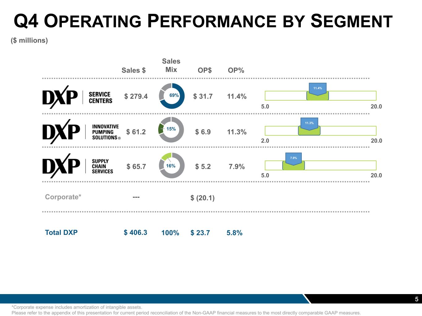 Q4 OPERATING PERFORMANCE BY SEGMENT 5 ($ millions) *Corporate expense includes amortization of intangible assets. Please refer to the appendix of this presentation for current period reconciliation of the Non-GAAP financial measures to the most directly comparable GAAP measures. Sales $ Corporate* OP$ OP% $ 279.4 $ 61.2 $ 65.7 --- $ 31.7 $ 6.9 $ 5.2 $ (20.1) 11.4% 11.3% 7.9% Total DXP $ 406.3 $ 23.7 5.8% 11.4% 5.0 20.0 2.0 20.0 5.0 20.0 7.9% Sales Mix 69% 15% 16% 100% 11.3%