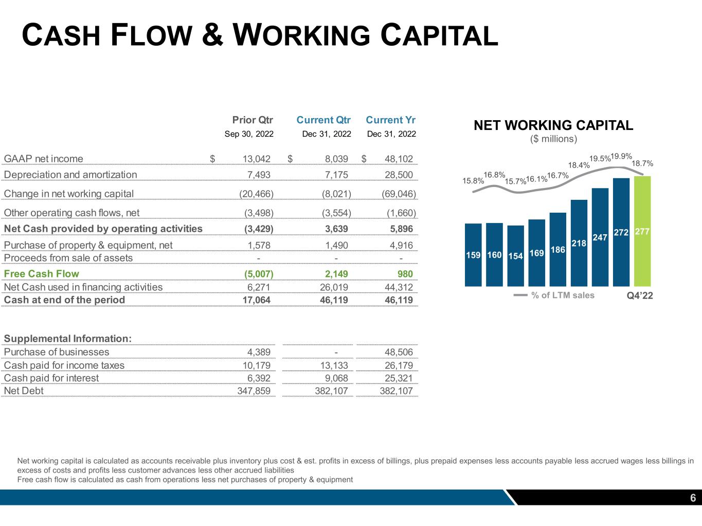 Net working capital is calculated as accounts receivable plus inventory plus cost & est. profits in excess of billings, plus prepaid expenses less accounts payable less accrued wages less billings in excess of costs and profits less customer advances less other accrued liabilities Free cash flow is calculated as cash from operations less net purchases of property & equipment CASH FLOW & WORKING CAPITAL 6 159 160 154 169 186 218 247 272 277 15.8% 16.8% 15.7%16.1%16.7% 18.4% 19.5%19.9% 18.7% 0.0% 5.0% 10.0% 15.0% 20.0% NET WORKING CAPITAL ($ millions) % of LTM sales Q4’22 Prior Qtr Current Qtr Current Yr Sep 30, 2022 Dec 31, 2022 Dec 31, 2022 GAAP net income 13,042$ 8,039$ 48,102$ Depreciation and amortization 7,493 7,175 28,500 Change in net working capital (20,466) (8,021) (69,046) Other operating cash flows, net (3,498) (3,554) (1,660) Net Cash provided by operating activities (3,429) 3,639 5,896 Purchase of property & equipment, net 1,578 1,490 4,916 Proceeds from sale of assets - - - Free Cash Flow (5,007) 2,149 980 Net Cash used in financing activities 6,271 26,019 44,312 Cash at end of the period 17,064 46,119 46,119 Supplemental Information: Purchase of businesses 4,389 - 48,506 Cash paid for income taxes 10,179 13,133 26,179 Cash paid for interest 6,392 9,068 25,321 Net Debt 347,859 382,107 382,107