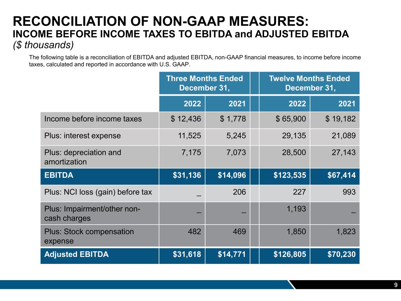 RECONCILIATION OF NON-GAAP MEASURES: INCOME BEFORE INCOME TAXES TO EBITDA and ADJUSTED EBITDA ($ thousands) Three Months Ended December 31, Twelve Months Ended December 31, 2022 2021 2022 2021 Income before income taxes $ 12,436 $ 1,778 $ 65,900 $ 19,182 Plus: interest expense 11,525 5,245 29,135 21,089 Plus: depreciation and amortization 7,175 7,073 28,500 27,143 EBITDA $31,136 $14,096 $123,535 $67,414 Plus: NCI loss (gain) before tax _ 206 227 993 Plus: Impairment/other non- cash charges _ _ 1,193 _ Plus: Stock compensation expense 482 469 1,850 1,823 Adjusted EBITDA $31,618 $14,771 $126,805 $70,230 The following table is a reconciliation of EBITDA and adjusted EBITDA, non-GAAP financial measures, to income before income taxes, calculated and reported in accordance with U.S. GAAP. 9