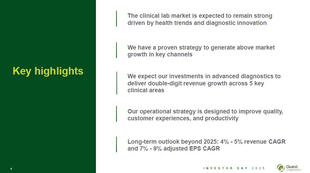 Safe harbor disclosure The statements in this presentation which are not historical facts may be forward-looking statements. Readers are cautioned not to place undue reliance on forward-looking statements, which speak only as of the date that they are made and which reflect management's current estimates, projections, expectations or beliefs and which involve risks and uncertainties that could cause actual results and outcomes to be materially different. Risks and uncertainties that may affect the future results of the company include, but are not limited to, adverse results from pending or future government investigations, lawsuits or private actions, the competitive environment, the complexity of billing, reimbursement and revenue recognition for clinical laboratory testing, changes in government regulations, changing relationships with customers, payers, suppliers or strategic partners, acquisitions and other factors discussed in the company's most recently filed Annual Report on Form 10-K and in any of the company's subsequently filed Quarterly Reports on Form 10-Q and Current Reports on Form 8-K, including those discussed in the "Business," "Risk Factors," "Cautionary Factors that May Affect Future Results," and "Management's Discussion and Analysis of Financial Condition and Results of Operations" sections of those reports. In the following presentation, references to adjusted EPS refer to adjusted diluted EPS. Any references to operating margin(s) refer to adjusted operating income as a percentage of net revenues. Any references to free cash flow refer to cash flow from operations less capital expenditures. Adjusted EPS, operating margin and free cash flow are non-GAAP financial measures. Please see the explanation of these non-GAAP measures, including the comparable GAAP measure, at the end this presentation and on Investor Relations page on our website. 3 Investor Day 2025 Quest Diagnostics