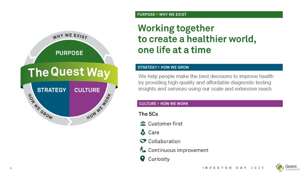 Why we exist Purpose The Quest Way Strategy Culture How we grow How we work Purpose Why we exist Working together to create a healthier world, one life at a time Strategy How we grow We help people make the best decisions to improve health by providing high-quality and affordable diagnostic testing insights and services using our scale and extensive reach Culture How we work The 5Cs Customer first Care Collaboration Continuous improvement Curiosity 5 Investor Day 2025 Quest Diagnostics