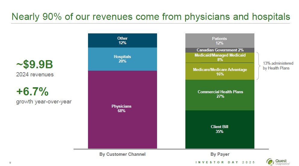 We are well positioned for growth in Canada's lab market 2024 Total Canadian Lab Market ~$5B Hospital/Public Health 79% Community Labs 8% LifeLabs 13% ~3% CAGR LifeLabs British Columbia Ontario Saskatchewan 41M people Leading provider of clinical laboratory testing in Canada Headquartered in Toronto 5 primary labs and 350 collection centers Strong growth opportunities in Canada Broadening access to lab services, including advanced diagnostics Expanding into new provinces Increasing consumer interest 8 Investor Day 2025 Quest Diagnostics
