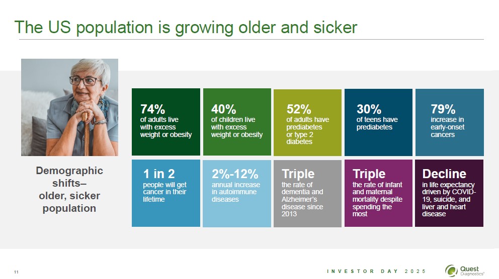 Macro trends continue to shape healthcare and favor Quest Demographic shifts-older, sicker population Innovations in lab diagnostics Greater adoption of AI and automation Consumer focus on prevention and wellness 10 Investor Day 2025 Quest Diagnostics