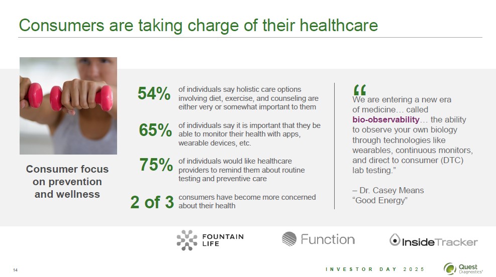 Consumers are taking charge of their healthcare Consumer focus on prevention and wellness 54% of individuals say holistic care options involving diet, exercise, and counseling are either very or somewhat important to them 65% of individuals say it is important that they be able to monitor their health with apps, wearable devices, etc. 75% of individuals would like healthcare providers to remind them about routine testing and preventive care 2 of 3 consumers have become more concerned about their health "We are entering a new era of medicine… called bio-observability… the ability to observe your own biology through technologies like wearables, continuous monitors, and direct to consumer (DTC) lab testing." - Dr. Casey Means "Good Energy" Fountain Life Function InsideTracker 14 Investor Day 2025 Quest Diagnostics