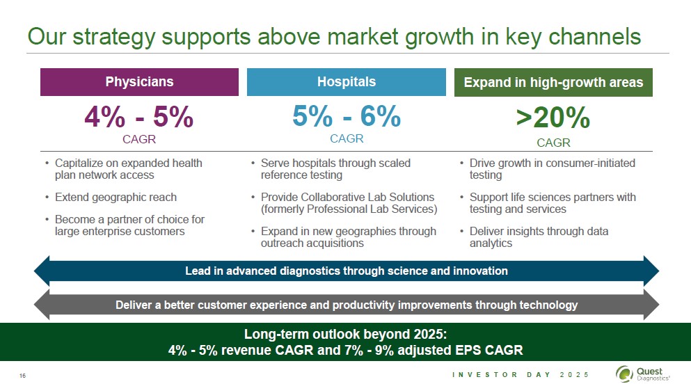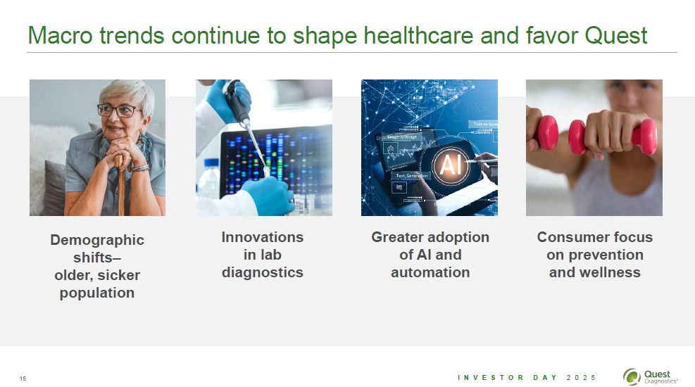 Macro trends continue to shape healthcare and favor Quest Demographic shifts-older, sicker population Innovations in lab diagnostics Greater adoption of AI and automation Consumer focus on prevention and wellness 15 Investor Day 2025 Quest Diagnostics