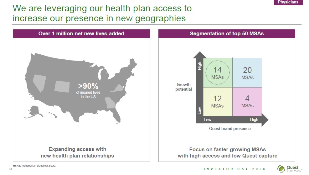 Our unique strengths will enable us to capitalize on physician market trends 1 Scale 2 Broad access (PSCs, IOPs) 3 Clinical innovation 4 Health plan access 5 Value PSCs: patient service centers; IOPs: in-office phlebotomists. 17 Investor Dat 2025 Quest Diagnostics