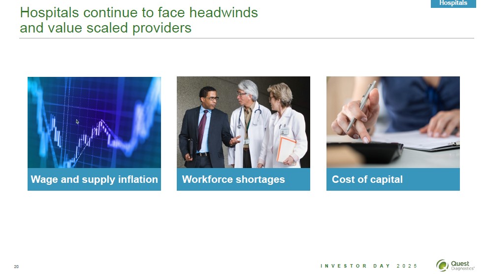 Hospitals continue to face headwinds and value scaled providers Hospitals Wage and supply inflation Workforce shortages Cost of capital 20 Investor Day Quest Diagnostics