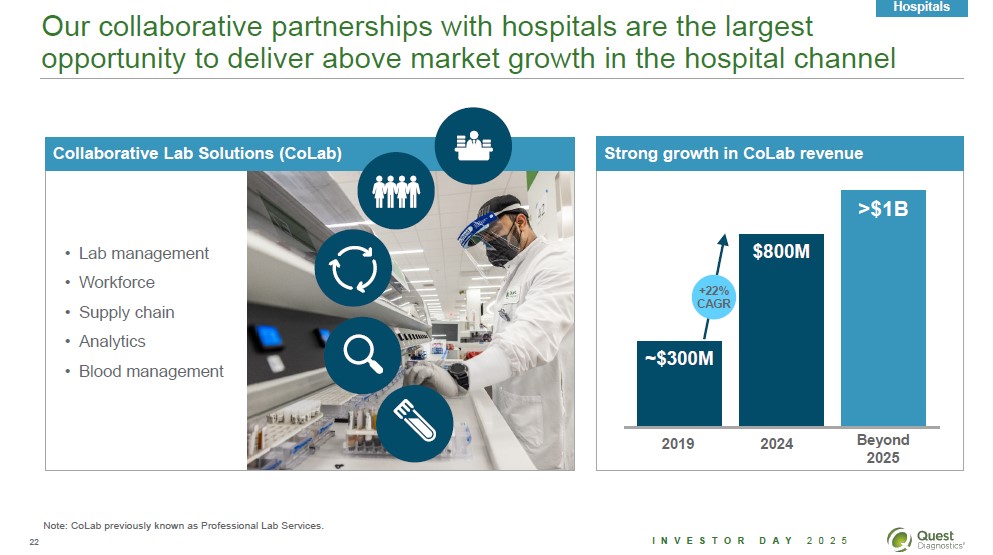 We have a diverse, collaborative approach for helping hospitals improve quality, efficiency, and access to capital Hospitals Reference testing Comprehensive menu across continuum of care Reduces the need for hospitals to invest in advanced technologies Over $1B in revenues today Collaborative Lab Solutions (CoLab) Professional lab management and related services based on expertise and scale Broader than Professional Lab Services ~800M in revenues today Outreach/JVs Access to capital to invest in core assets Continued access to diagnostics innovation Enhanced affordability Note: CoLab previously known as Professional Lab Services. 21 Investor Day 2025 Quest Diagnostics