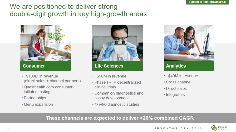 Our collaborative partnerships with hospitals are the largest opportunity to deliver above market growth in the hospital channel Hospitals Collaborative Lab Solutions (CoLab) Strong growth in CoLab revenue Lab management Workforce Supply chain Analytics Blood collection ~300M 2019 +22% CAGR $800M 2024 >$1B Beyond 2025 Note: CoLab previously known as Professional Lab Services. 22 Investor Day 2025 Quest Diagnostics